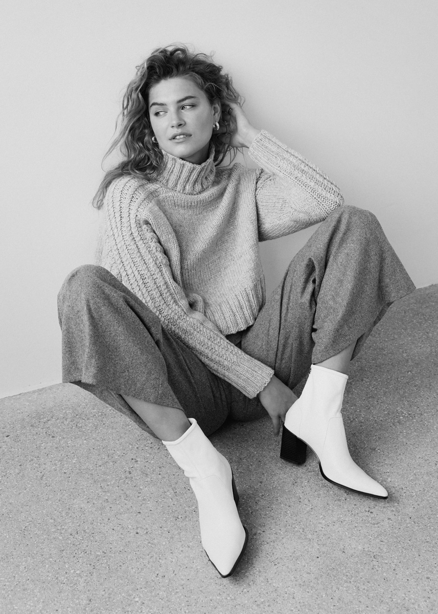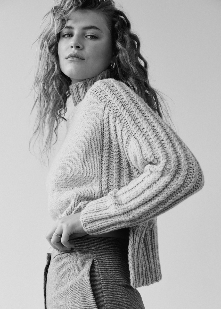 450 (500–550) г светло-серой мелан- жевой (цв. 1) пряжи Alta Moda Cashmere 16 (78% шерсти мерино 16 микрон, 12% кашемира, 10% полиамида, 110 м/ 50 г) фирмы Lana Grossa; прямые спицы № 7 и № 8, круго- вые спицы № 7 длиной 40 см.