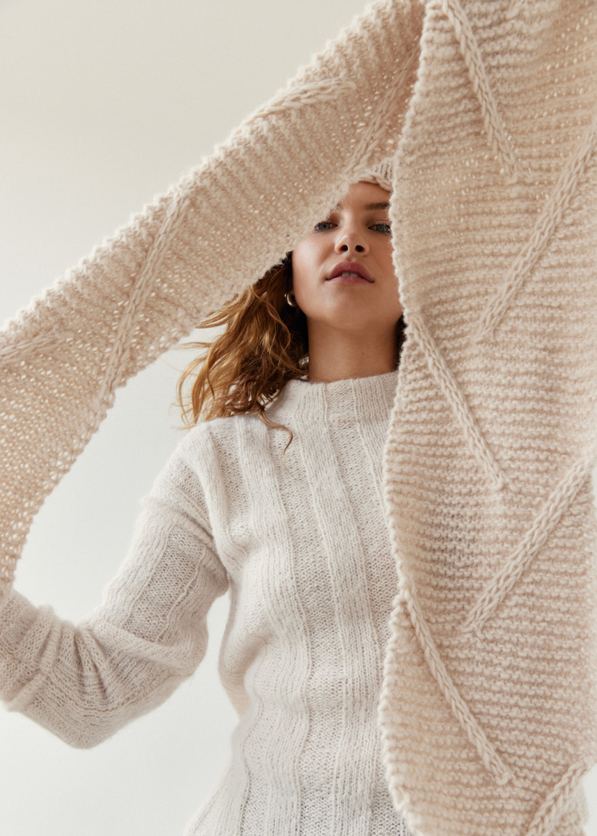 275 (300–325) г кремовой (цв. 2) пря- жи Setasuri (69% альпака сури, 31% шелка, 212 м/25 г) фирмы Lana Grossa; прямые спицы № 4 и № 4,5, круговые спицы № 4 длиной 40 см