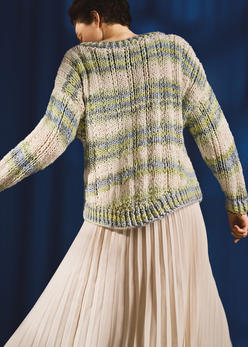 Lana Grossa „About Berlin Bulky Print“(50% хлопок; 50% микромодаль; длина нитки 47m/50 g), 750 (850) г in тёмно-серый/сирень/ жёлто-зеленый/светло-зелёный (цв 106); сп. № 9, 1 кр. сп. № 9 длиной 60 и 100 см