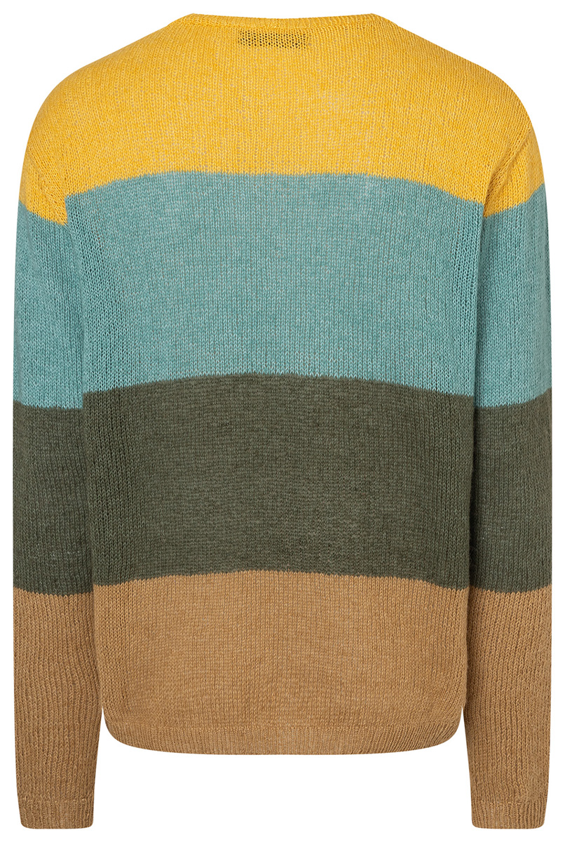 Lana Grossa Allora (76% хлопок, 14% шерсть (меринос), 10% альпака (беби), длина нити 300 m/50 g), 100 г темно зелёный (цв 4), 100 г бирюзовый (цв 5), 100 г легко коричневый (цв 22) и 50 г жёлтый (цв 1); сп. № 3 и 4, 1 кр. сп. № 3, длиной 40 см