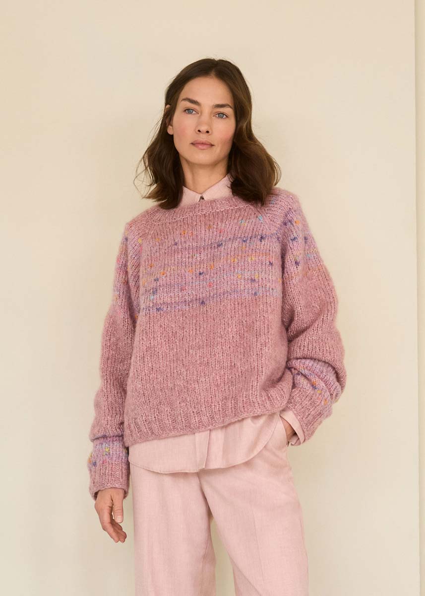 Lana Grossa-Qualität „Alpaca Air II“ (50 % альпака (файн), 27 % полиамид, 14 % хлопок, 9 % шерсть (меринос), длина нити = ca 140 m/50 g): 250 (250 - 300 - 300) г ветхо розвый (цв 29), Lana Grossa-Qualität „Cassata“ (54 % шерсть (меринос), 30 % полиамид, 16 % хлопок, длина нити = ca 175 m/50 g): 50 (100 - 100 - 100) г мягко- фиолетовый/розовый/жёлтый/пурпурный (цв 3); кр. сп. № 4,5 и 5,5; чул. сп. № 4,5.