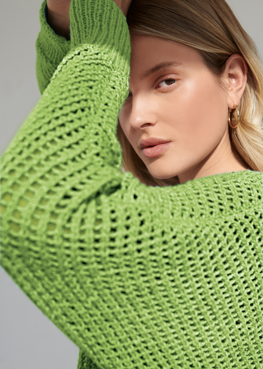 400 (450–500–550) г цвета зеленого яблока (цв. 10) пряжи Alta Moda Cotolana (45% мериносовой шерсти, 45% хлопка пима, 10% полиамида, 150 м/50 г) фирмы Lana Grossa; прямые спицы № 4,5 и № 5, круговые спицы № 5 длиной 100 см.
