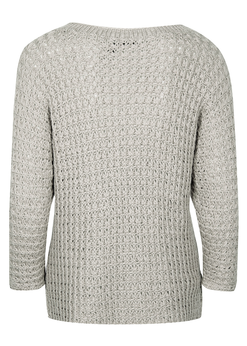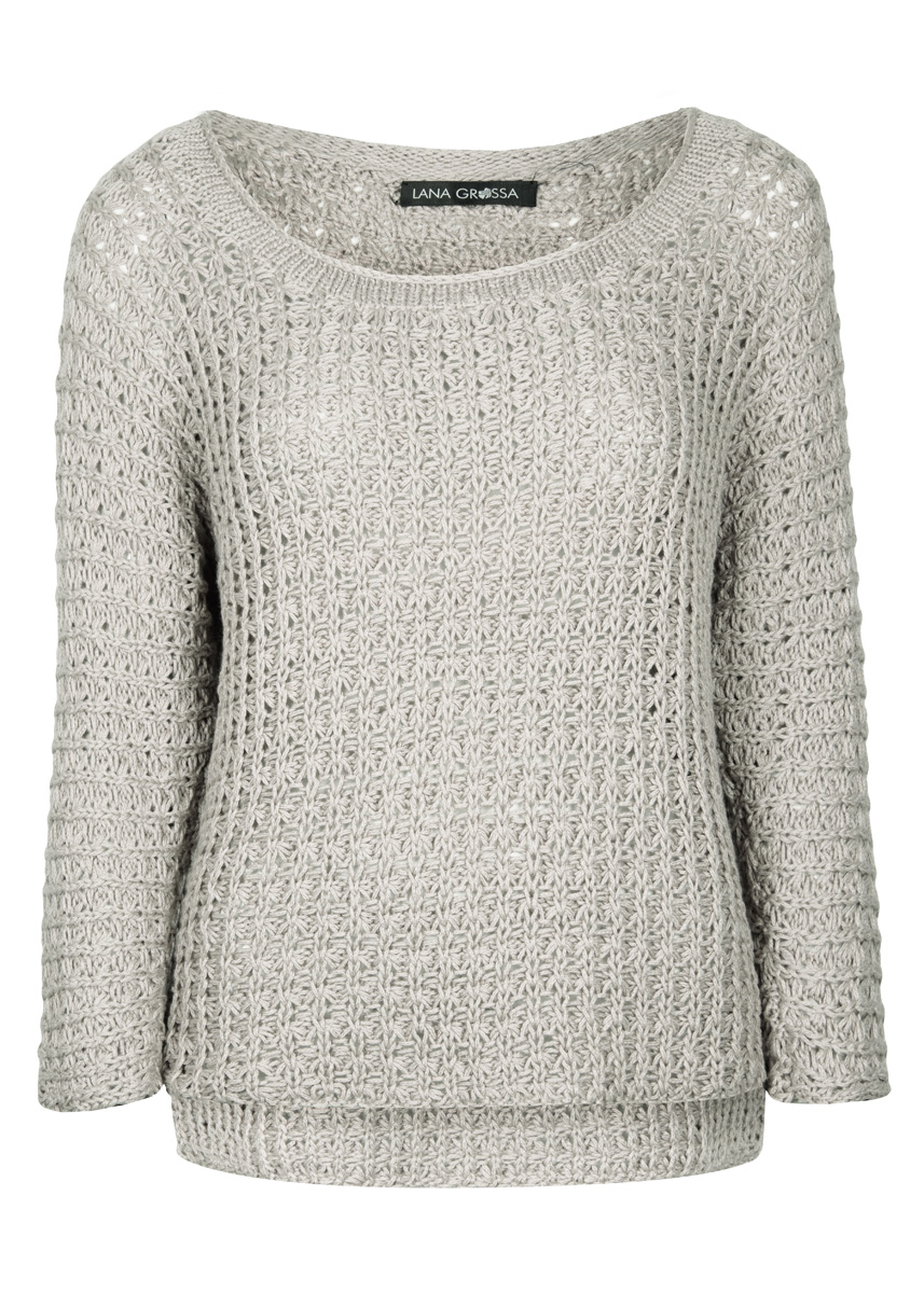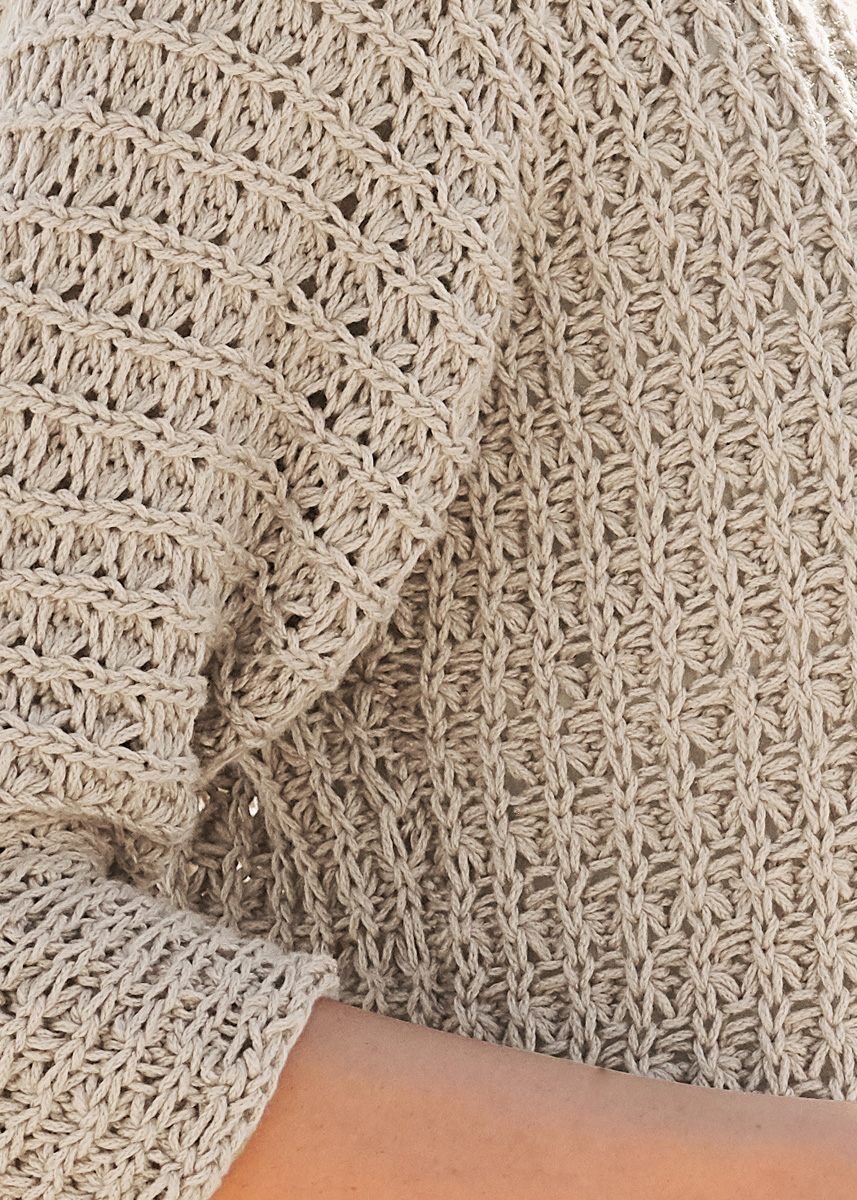 350 (400–450) г цвета шелка-сырца (цв. 8) пряжи Alta Moda Cotolana (45% мериносовой шерсти, 45% хлопка пима, 10% полиамида, 150 м/50 г) фирмы Lana Grossa; прямые спицы № 5,5, круговые спицы № 5,5 длиной 100 см, круговые спицы № 4,5 длиной 40 см