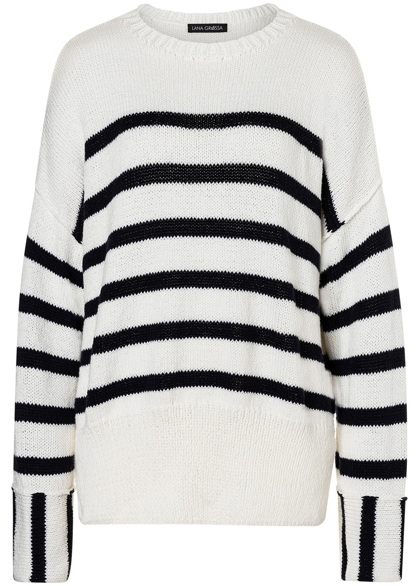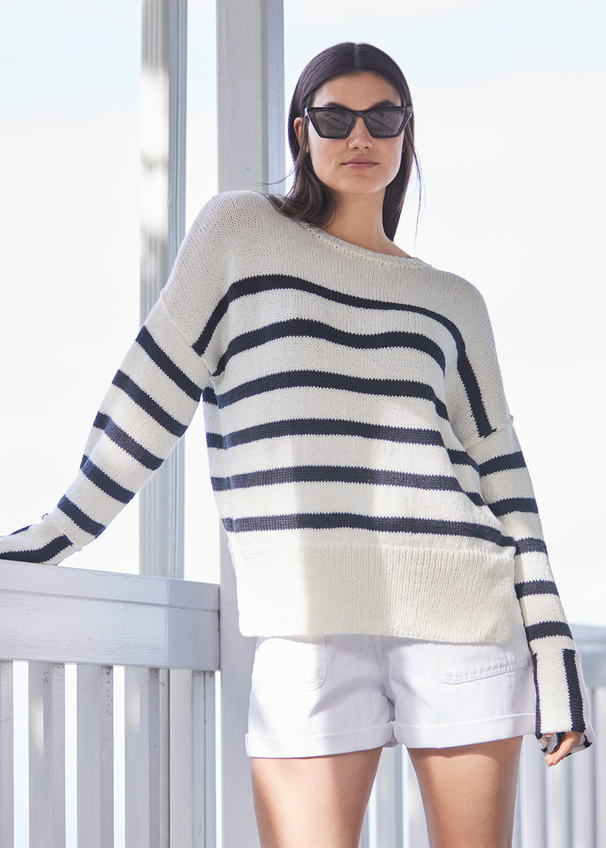 Lana Grossa Alta Moda Cotolana (45% шерсть (меринос), 45% хлопок (пима), 10% полиамид, длина нити 150 m/50 g), 350 (400–450) г светло бежевый (цв 19) и 150 (150 – 200) г тёмно-синий (цв 29); сп. № 4 и 1 кр. сп. № 4, 40 см