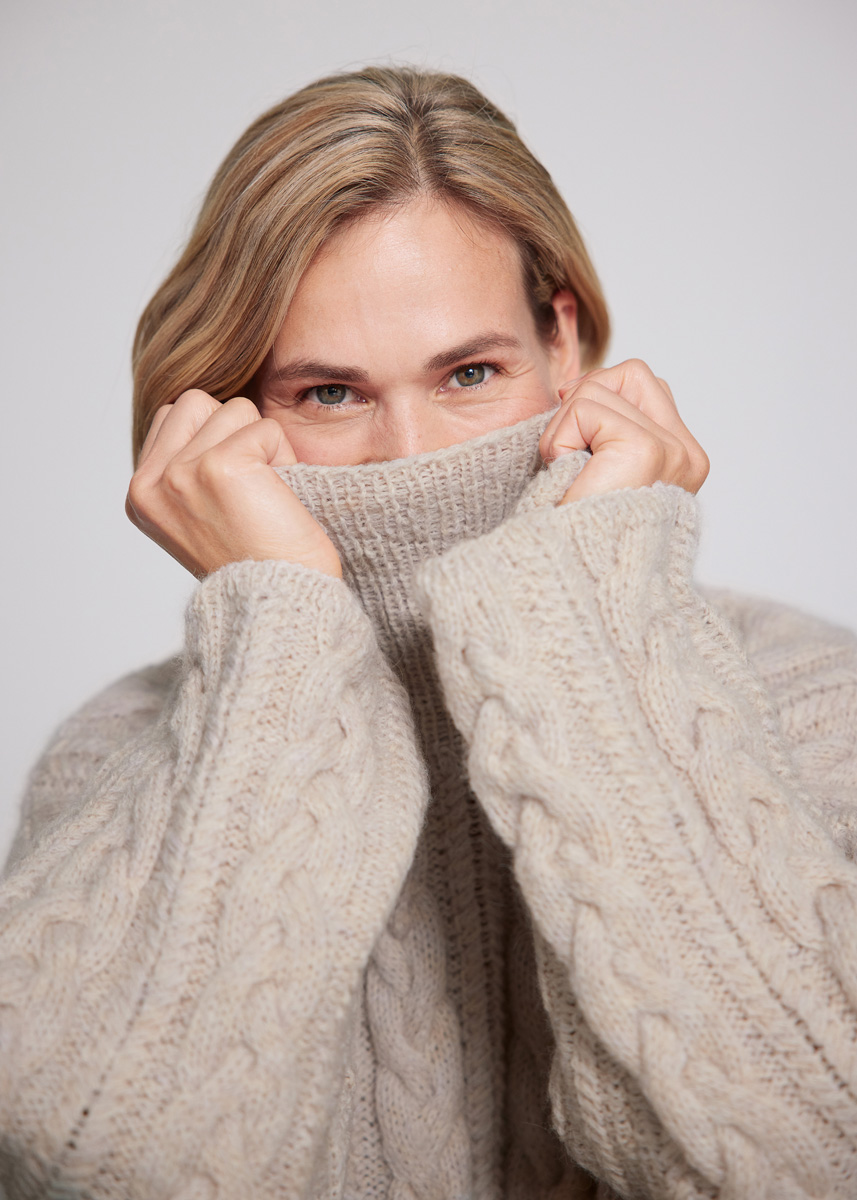 450 (500) г бело-бежевой (цв. 11) пряжи Baby Light (62% шерсти (ягненка) альпака, 23% овечьей (мериносовой) шерсти, 15% полиамида, 180 м/ 50 г) фирмы Lana Grossa; прямые спицы № 5 и № 6, круговые спицы № 5 длиной 40 см и 1 вспомогатель- ная спица для кос