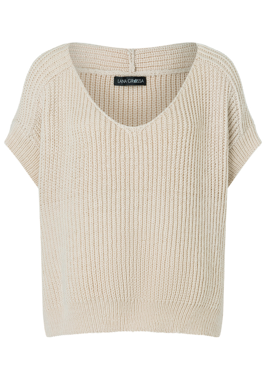 500 (550–600) г цвета ракушки (цв. 2096) пряжи Cool Wool (100% шерсти мерино экстра- файн, 160 м/50 г) фирмы Lana Grossa; прямые спицы № 2,5 и № 3, круговые спицы № 3 длиной 40 см, крючок № 2,5.