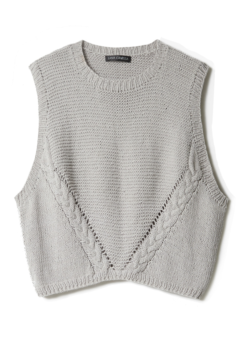 300 (350–400) г неж- но-серой (цв. 19) пряжи Dodici (65% хлоп- ка, 25% вискозы, 10% льна, 110 м/50 г) фир- мы Lana Grossa; прямые спицы № 4 и № 4,5, круговые спицы № 4 длиной 40 см, 1 вспо- могательная спица для кос.