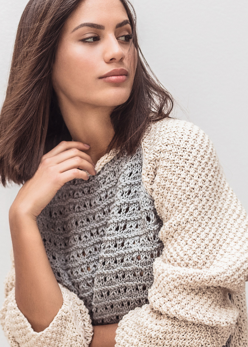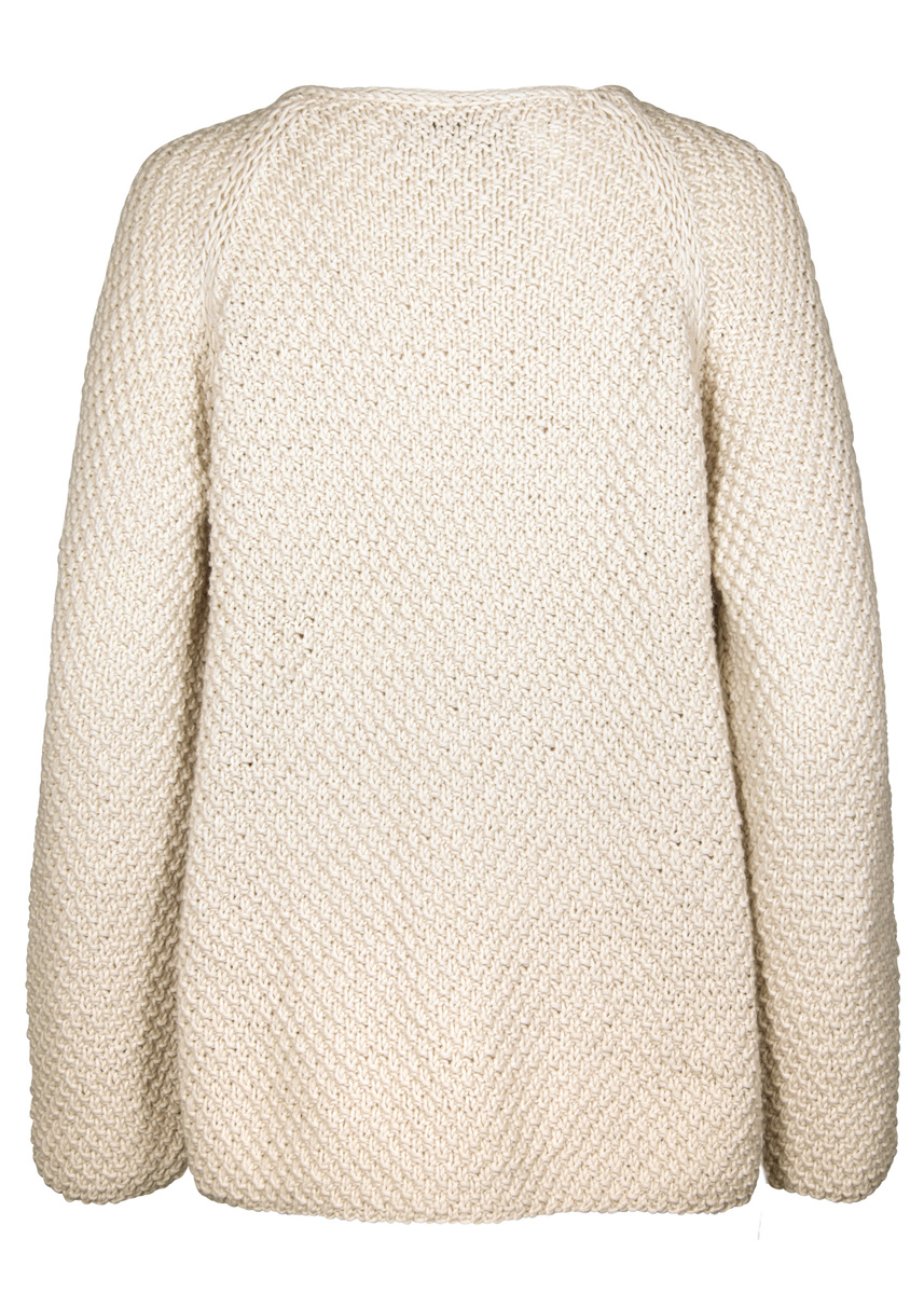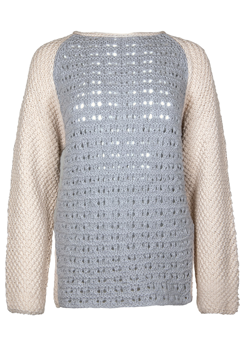 Lana Grossa Bingo (100% шерсть, длина нитки 80 m/50 g), 550 (600 – 650 – 700) г натуральный (цв 152) и Lana Grossa Bingo Mélange (100% шерсть, длина нити 80 m/50 g), 250 (250 – 300 – 300) г светло-серый меланжевый (цв 322); сп. № 5,5 и 1 кр. сп. № 5,5, длиной 40 см, 10 марк