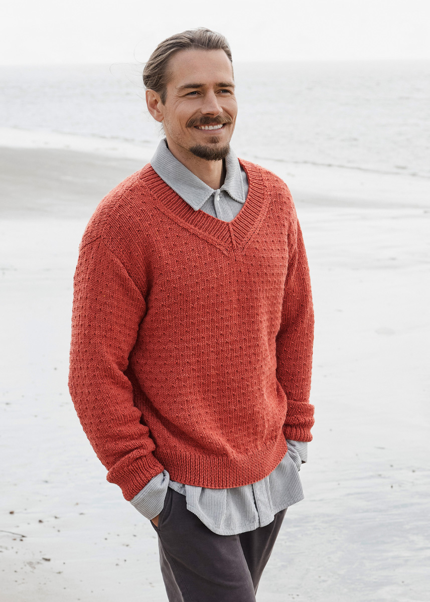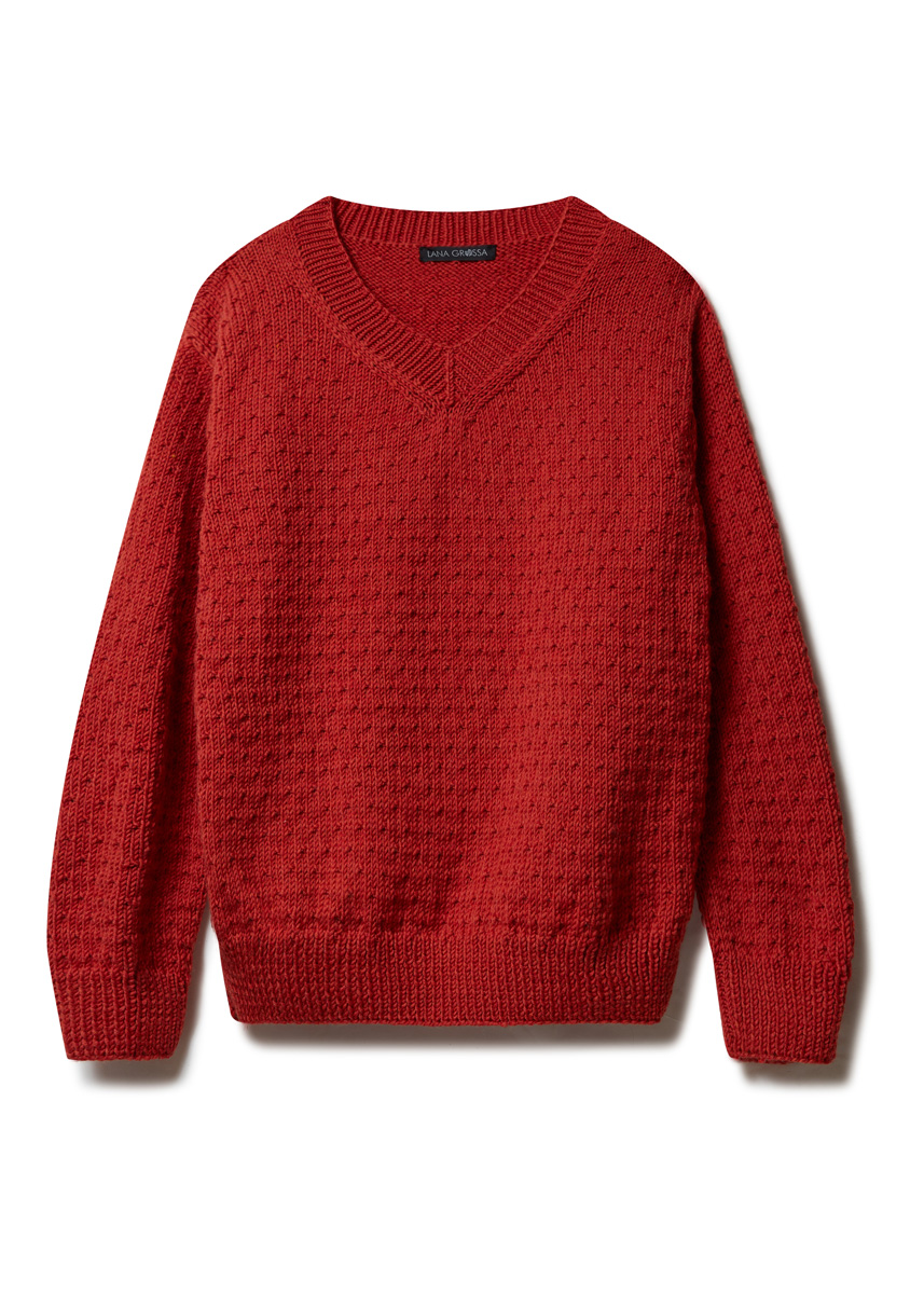 850 (900–950) г красной мелан- жевой (цв. 1031) пряжи Bingo Mélange (100% шерсти мерино экстрафайн, 80 м/50 г) фирмы Lana Grossa; прямые спицы № 3,5 и № 5,5, а также круговые спицы № 3,5 длиной 40 см.