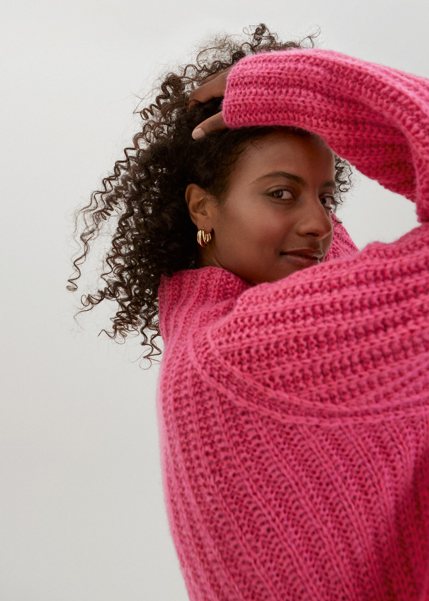 Lana Grossa-Qualität „Brigitte No. 2“ (47 % беби альпака, 45 % хлопок, 8 % шерсть (меринос), длина нити 140 m/50 g): ок. 400 (450) г пинк (цв. 19); сп. № 7, 1 кр. сп. № 7, 50 см длиной