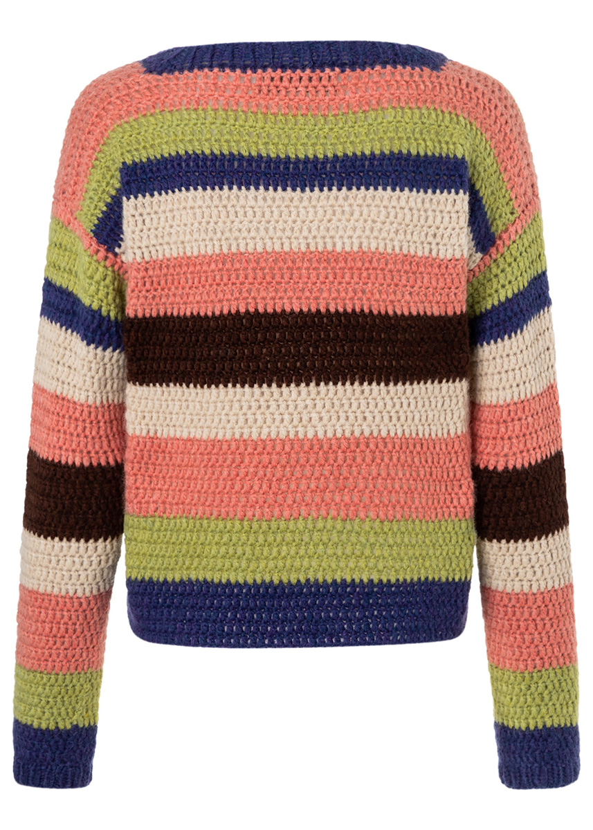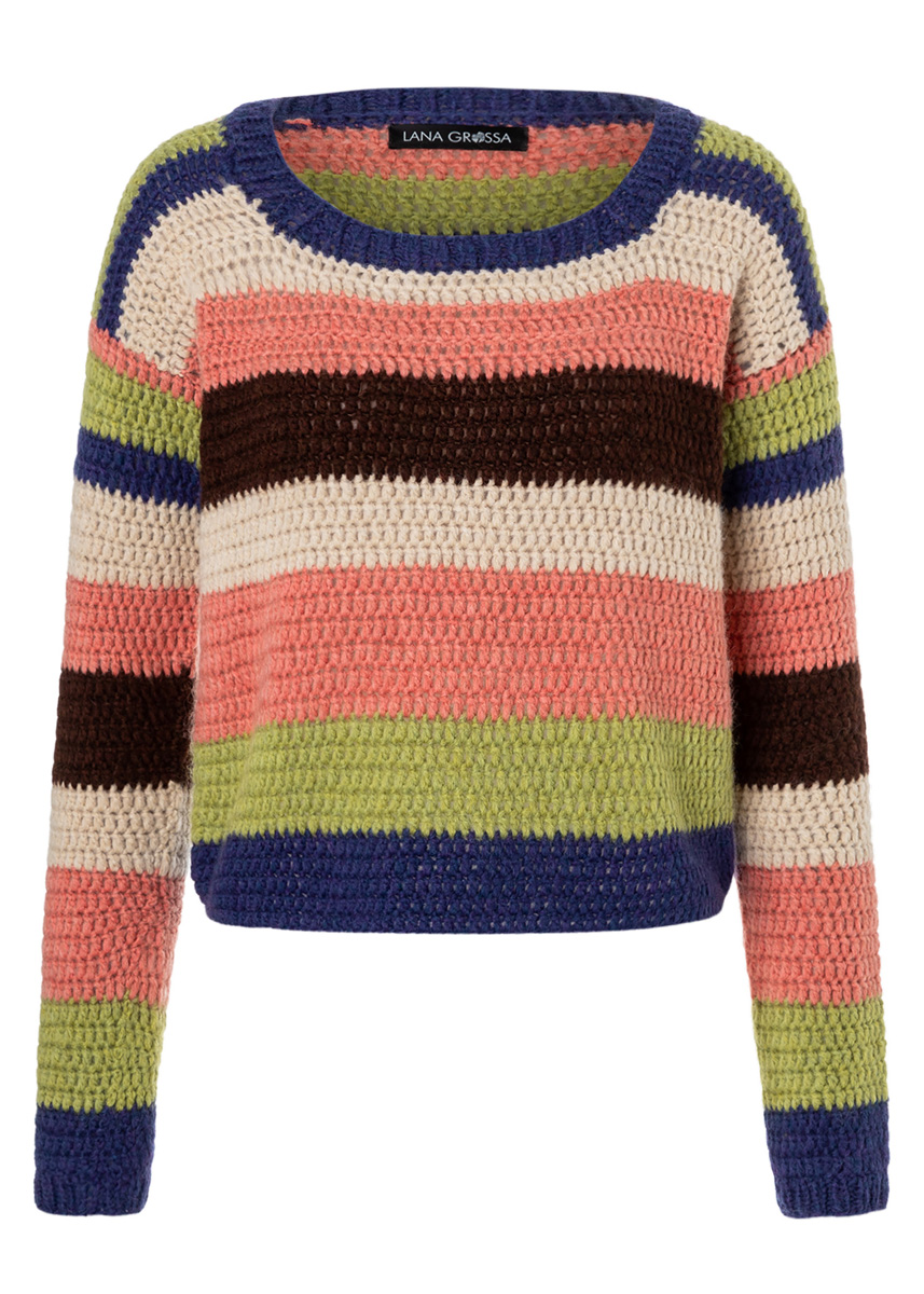 100 (150–150) г жел- то-розовой (цв. 46), 100 (150–150) г свет- ло-бежевой (цв. 47), 100 (150–150) г цвета киви (цв. 39), 100 (150–150) г сине-фио- летовой (цв. 53) и 50 (100–100) г цвета мокко (цв. 44) пряжи Brigitte No. 2 (47% альпака бэби, 45% хлопка, 8% шерсти мери- но, 140 м/50 г) фирмы Lana Grossa; крючок № 6, чулочные спицы № 6 и круговые спицы № 6 длиной 40 см.