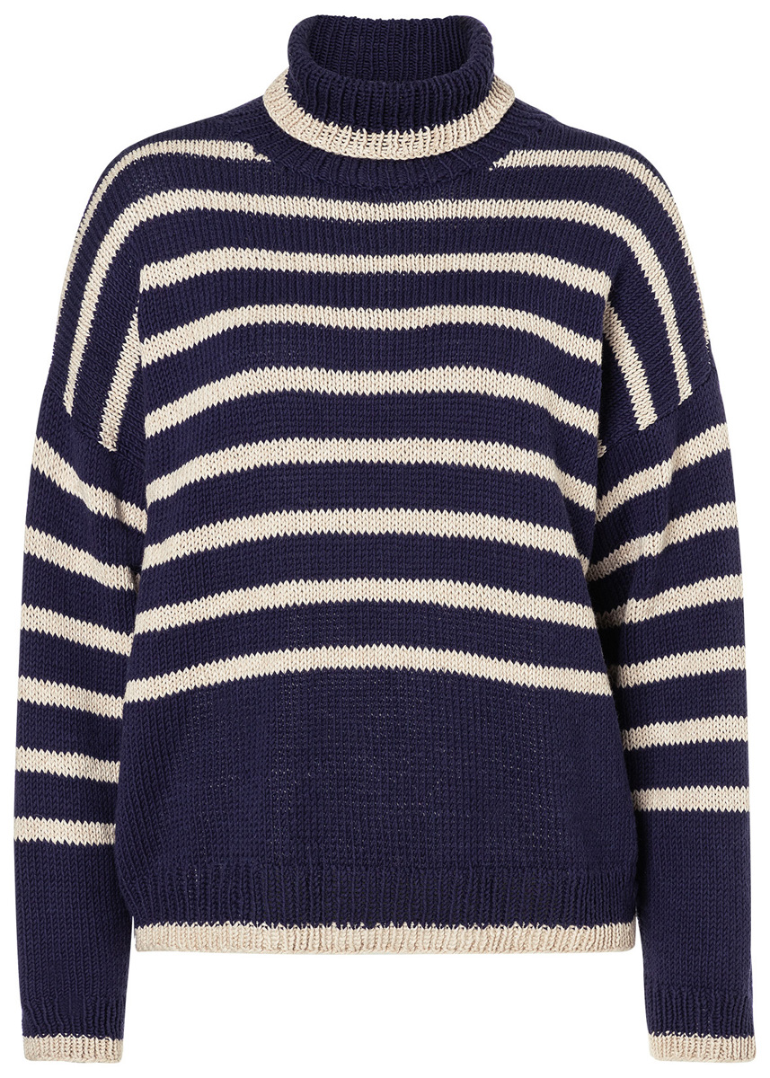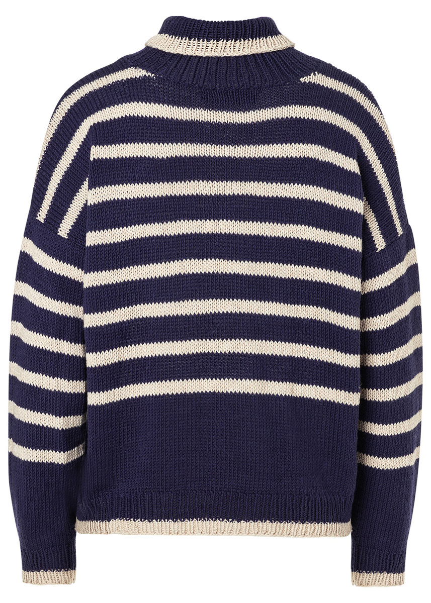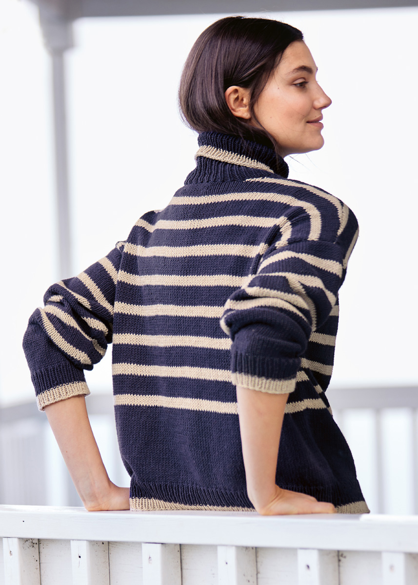 Lana Grossa Brigitte No. 4 (80% хлопок, 20% альпака (беби), длина нити 110 m/50 g), 350 (400 – 450) г тёмно-синий (цв 15) и 150 (200 – 250) г светло бежевый (цв 2); сп. № 4 и 4,5, 1 кр. сп. № 4, 40 см