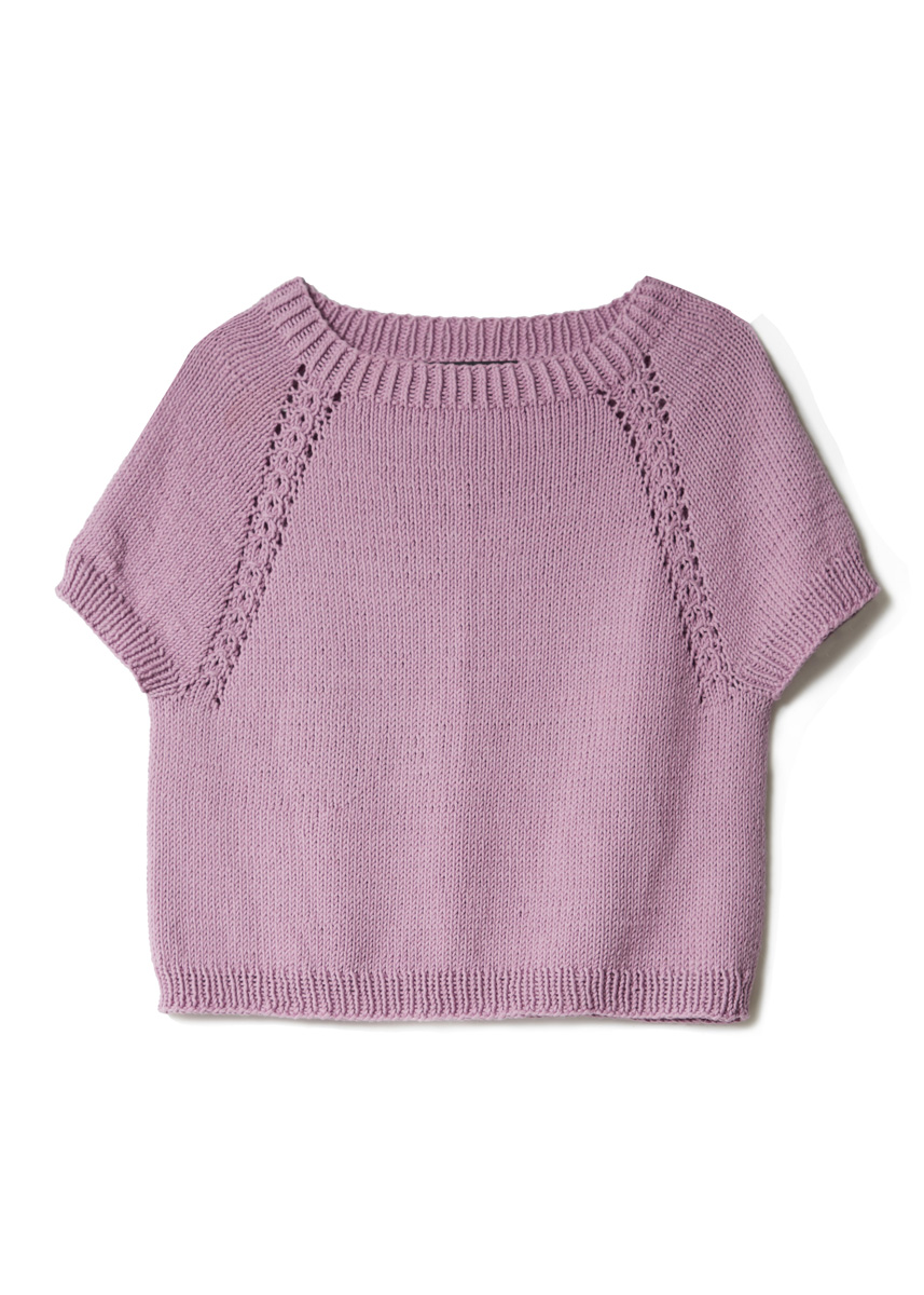 250 (300–350) г сире- нево-лиловой (цв. 46) пряжи Brigitte No. 4 (80% хлопка, 20% альпака бэби, 110 м/50 г) фирмы Lana Grossa; круговые спицы № 3 длиной 40 и 60 см, круговые спицы № 3,5 длиной 40, 60 и 80 см
