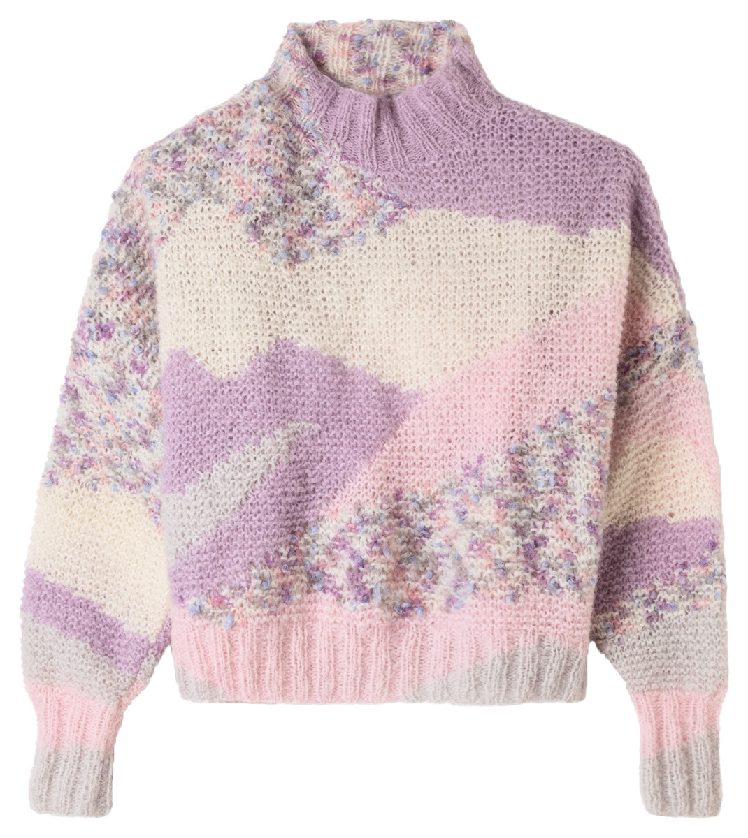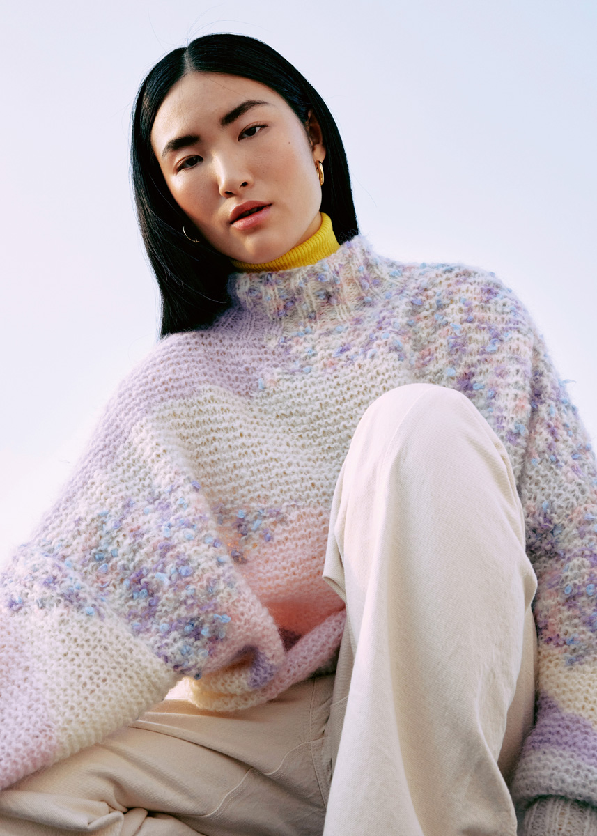 150 (200–200) г нежно-желтой/оран- жевой/желтой/светло-/темно-синей/сине-фиолетовой (цв. 202) пряжи Lala Berlin Brushy II (40% мохера суперкид, 36% шерсти мерино, 13% полиамида, 11% хлопка, 115 м/50 г), 100 (150–150) г белой суровой (цв. 8), 100 (150–150) г нежно-розовой (цв. 14), 100 (150–150) г серебристо-серой (цв. 11) и 100 г сиреневой (цв. 15) пряжи Lala Berlin Brushy (42% мохера суперкид, 38% шерсти мерино, 20% полиамида, 135 м/50 г) фирмы Lana Grossa; прямые спицы № 4,5 и № 5,5, круговые спицы № 4,5 длиной 40 см.