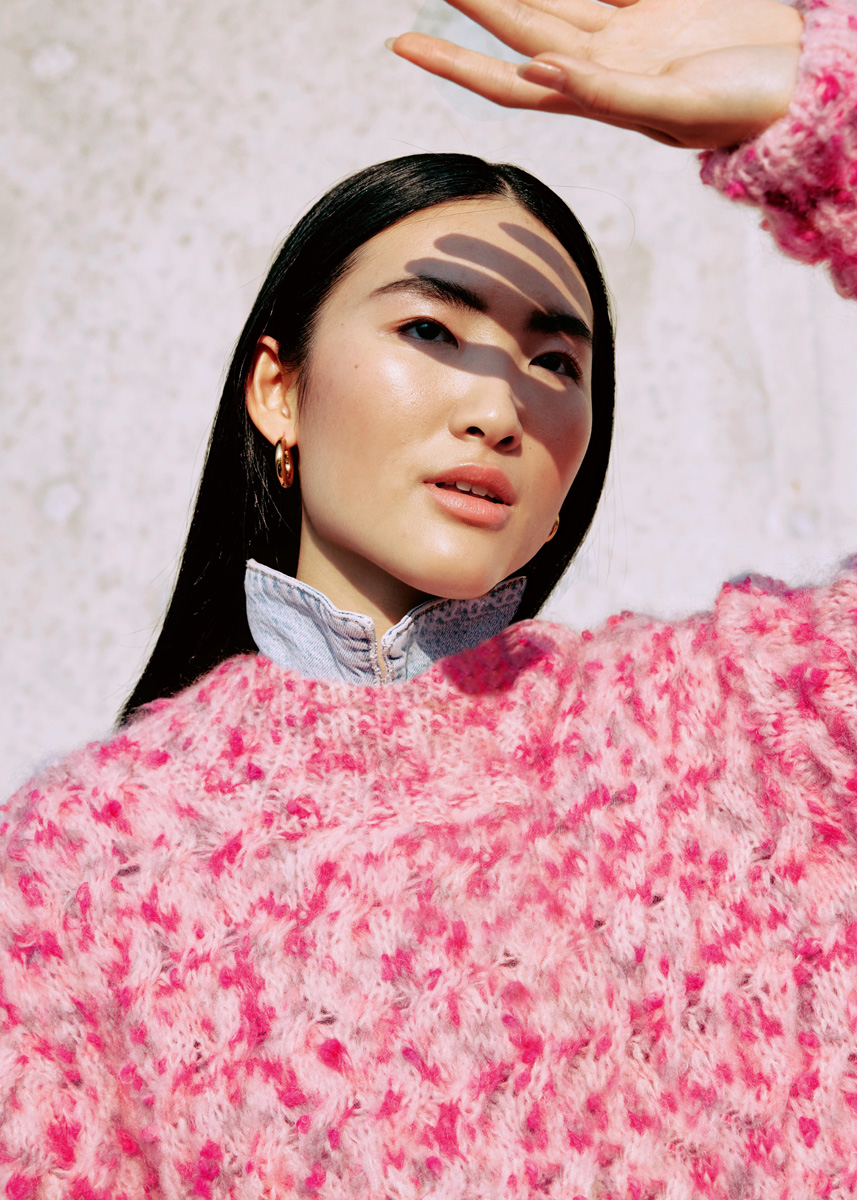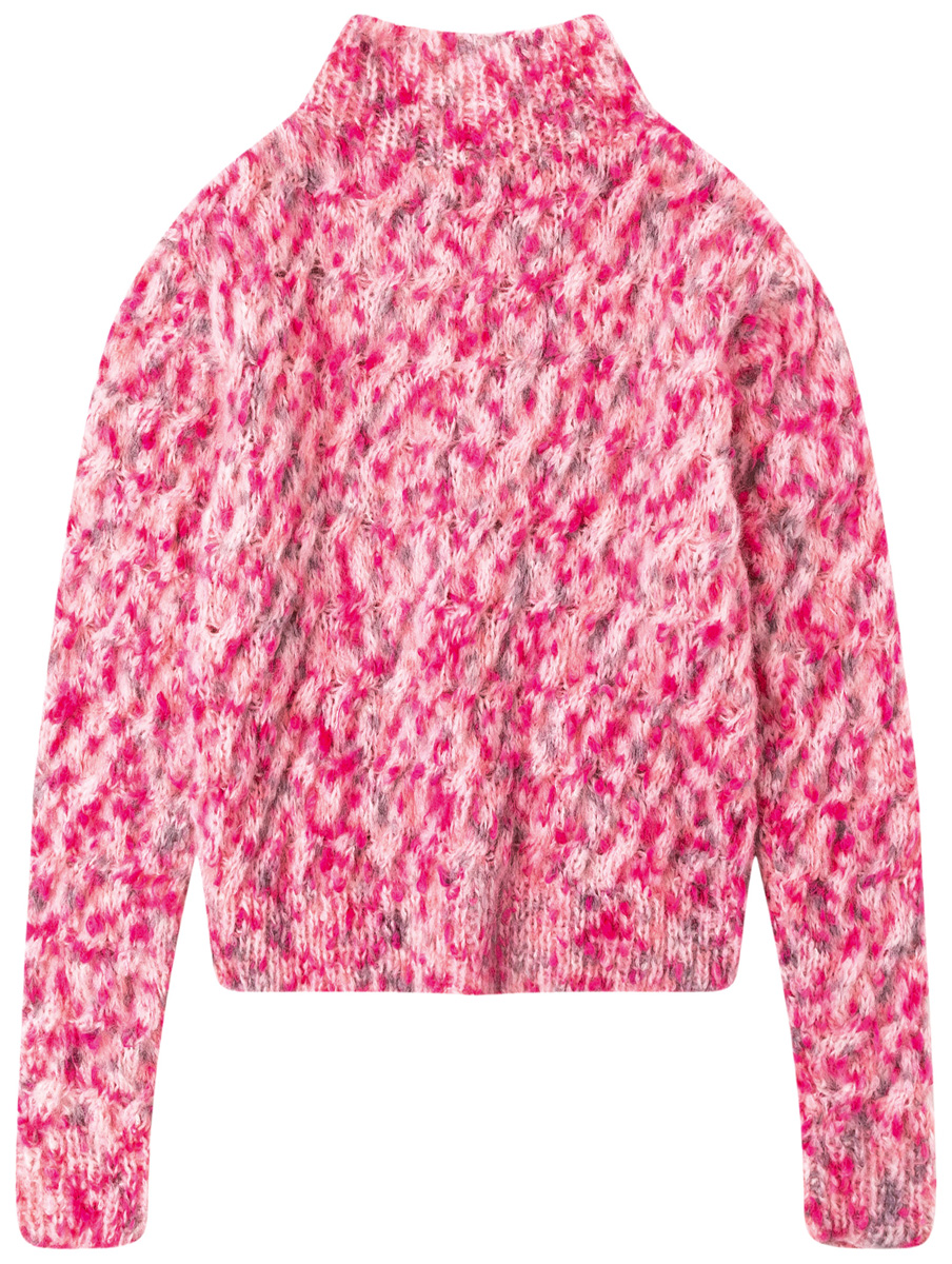 350 (400–450) г нежно-розовой/цвета гвоздики/ярко-розовой/серой (цв. 201) пряжи Lala Berlin Brushy II (40% мохера суперкид, 36% шерсти мерино, 13% полиамида, 11% хлопка, 115 м/50 г) фирмы Lana Grossa; прямые спицы № 4,5 и № 6, круговые спицы № 4,5 дли- ной 40 см, 1 вспомогательная спица для кос