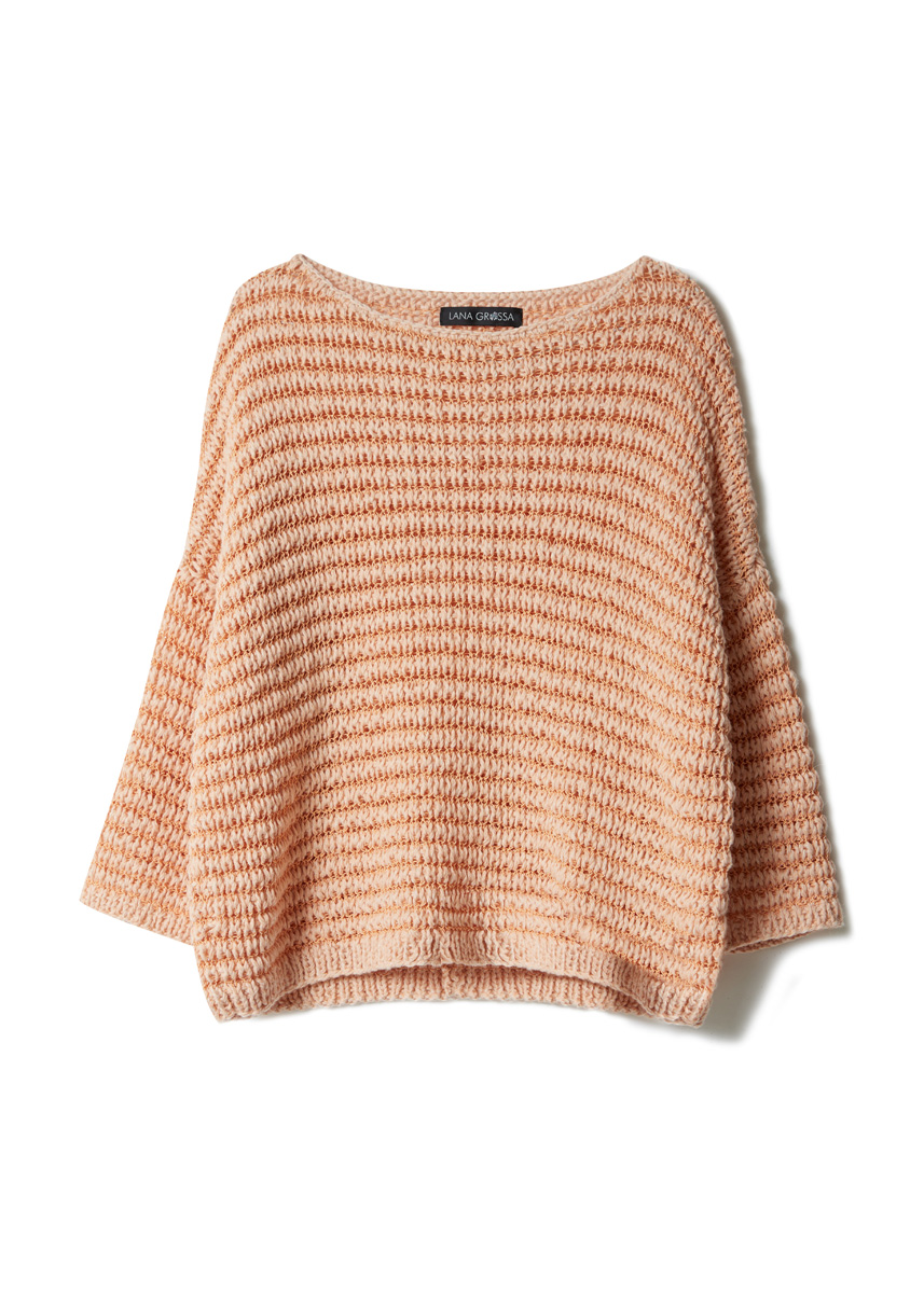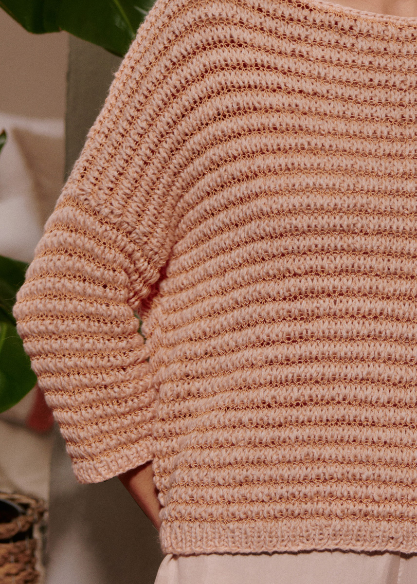 150 (200–200) г абрикосовой (цв. 41) пряжи Capri (55% хлопка, 30% полиамида, 15% шелка, 150 м/50 г) и 400 (450–500) г абрикосовой (цв. 24) пряжи Cara (57% альпака бэби, 33% хлоп- ка, 10% шерсти мерино, 120 м/50 г) фирмы Lana Grossa; прямые спицы № 5 и № 6, крю- чок № 5.