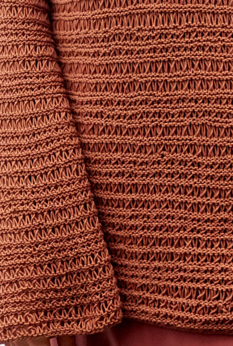 350 (400) 450 г цвета коричневой корицы (цв. 5) пряжи Cashair (60% хлопка, 30% нейлона, 10% кашемира, 225 м/50 г) фирмы Lana Grossa; прямые спицы № 3,5