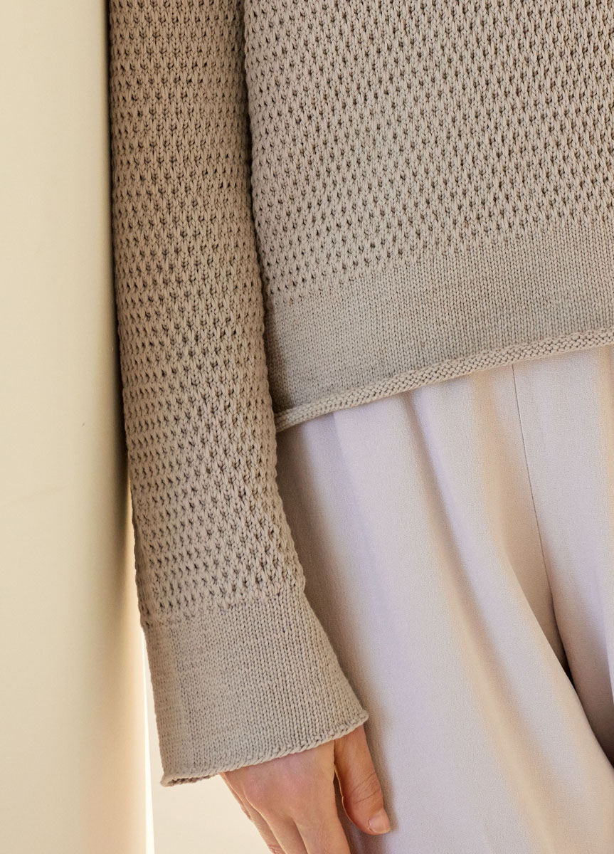 350 (400) 450 г цвета шелка-сырца (цв. 10) пряжи Cashair (60% хлопка, 30% нейлона, 10% кашемира, 225 м/50 г) фирмы Lana Grossa; прямые спицы № 3 и № 4, круговые спицы № 3 длиной 40 см