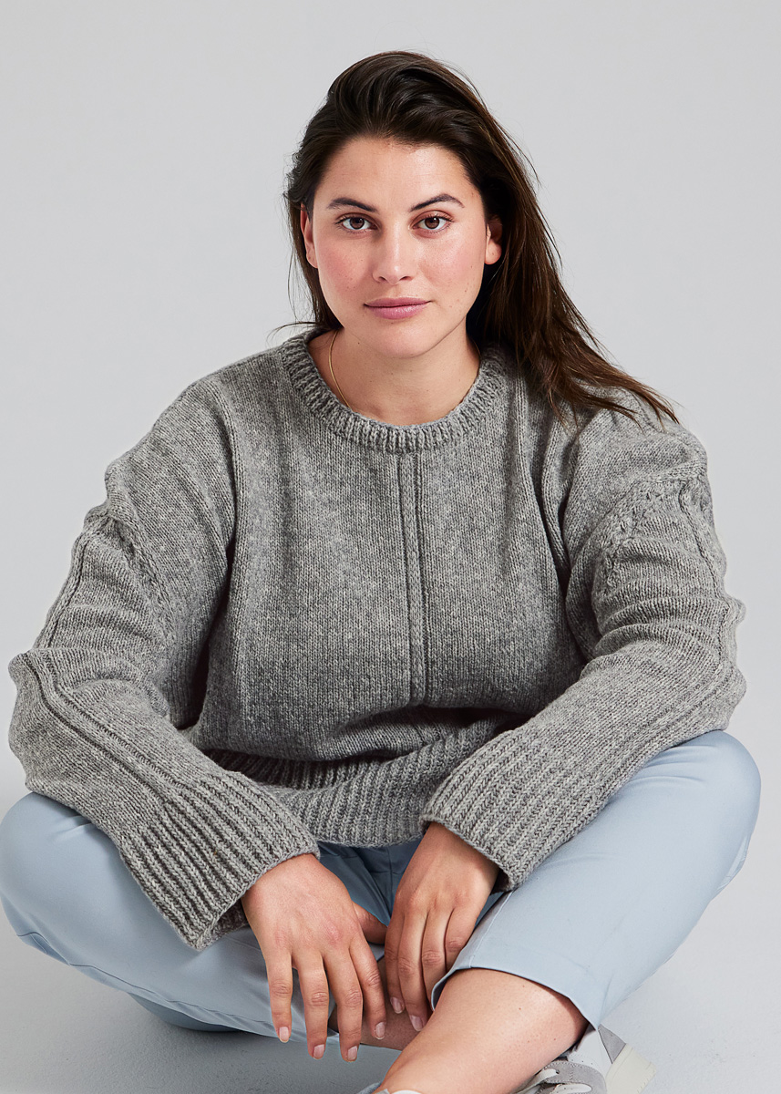 300 (300–350) г светло-серой (цв. 15) пряжи Cashmere 16 Fine (80% овечьей шерсти, 10% кашемира, 10% полиамида, 320 м/50 г) фирмы Lana Grossa; прямые спицы № 5, круговые спицы № 5 длиной 40 см, 1 вспомогательная спица для кос