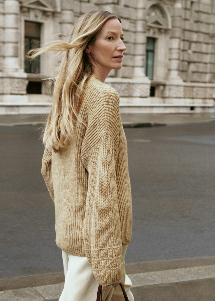 450 (475–500) г бежевой (цв. 2) пря- жи Cashmere Love (50% кашемира, 50% хлопка, 112 м/ 25 г) фирмы Lana Grossa; прямые спицы № 3 и круговые спицы № 2,5 длиной 40 см