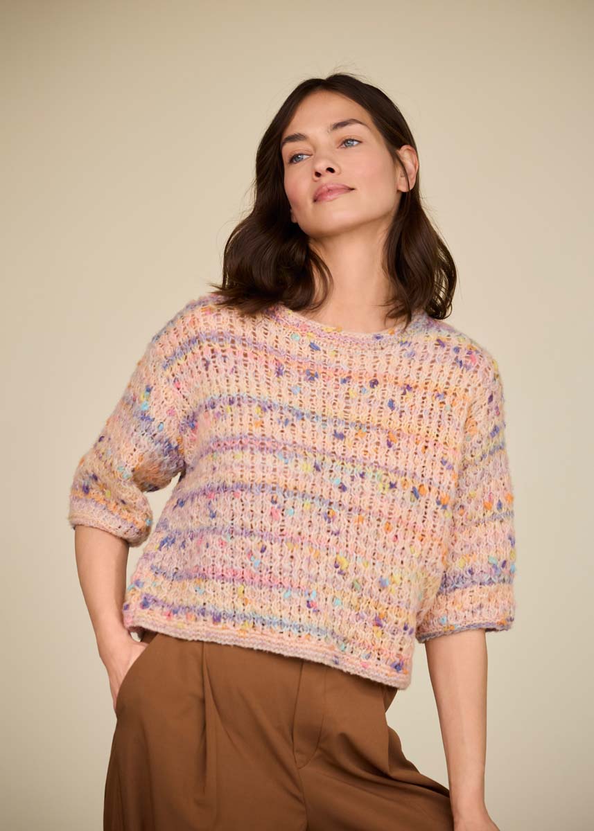 Lana Grossa-Qualität „Cassata“ (54 % шерсть (меринос), 30 % полиамид, 16 % хлопок, длина нити = ca 175 m/50 g): 150 (200–200–250) г персик/синий/жёлтый/ оранжевый/сирень (цв 1); сп. № 4,5 и 6; 1 кр. сп. № 4,5.