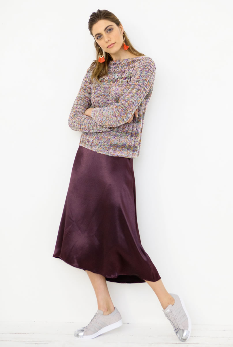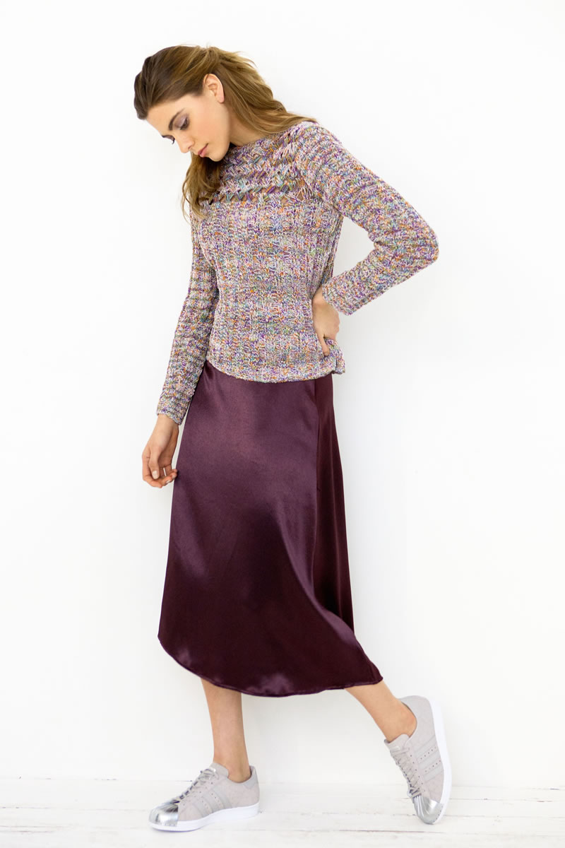 400 (450 – 500) г розовой/фиолетовой/фисташковой/оранжевой/бирюзовой (цвет 10) пряжи Coco фирмы Lana Grossa (67 % хлопка, 33 % нейлона, 115 м/50 г); прямые спицы № 4,5, 1 спица для косы