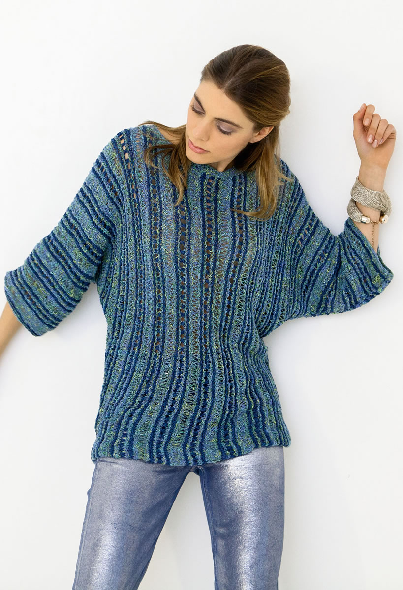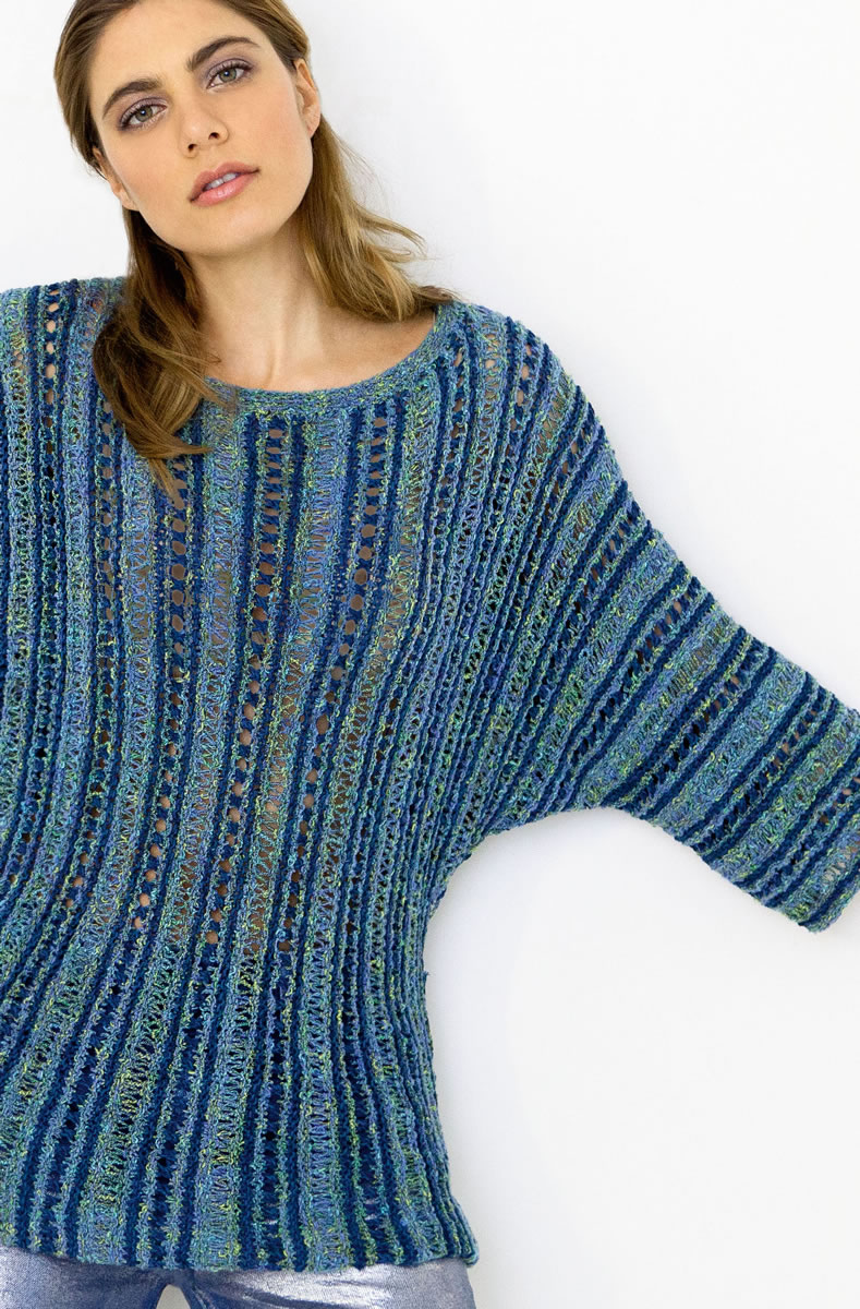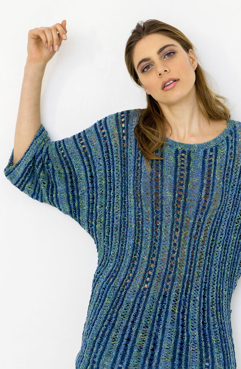 250 (300) г джинсовой/фисташковой/бирюзовой/голубой (цвет 8) пряжи Coco фирмы Lana Grossa (67 % хлопка, 33 % нейлона, 115 м/50 г) и 300 (350) г темно-синей (цвет 11) пряжи Portofino фирмы Lana Grossa (60 % хлопка, 40 % полиамида, 115 м/50 г), прямые спицы № 5 и круговые спицы № 4,5 длиной 40 см.