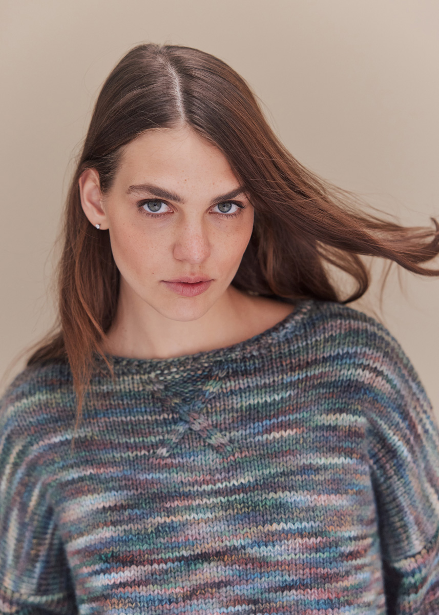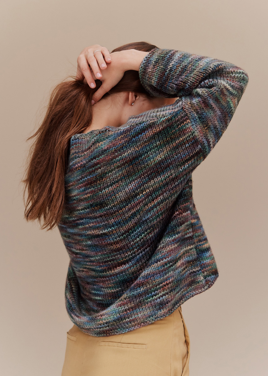 Lana Grossa-Qualität „Cool Merino Big Color“ (90 % шерсть (меринос), 10 % полиамид, длина нити = ок 90 m/50 g): ок 450 (500–550 - 600 - 650) г серый/жёлтый/ оливковый/бирюзовый/зелёный/тёмно-зелёный/охра (цв 412); сп. № 6 и 7; 1 кр. сп. № 6; 1 вспом. п
