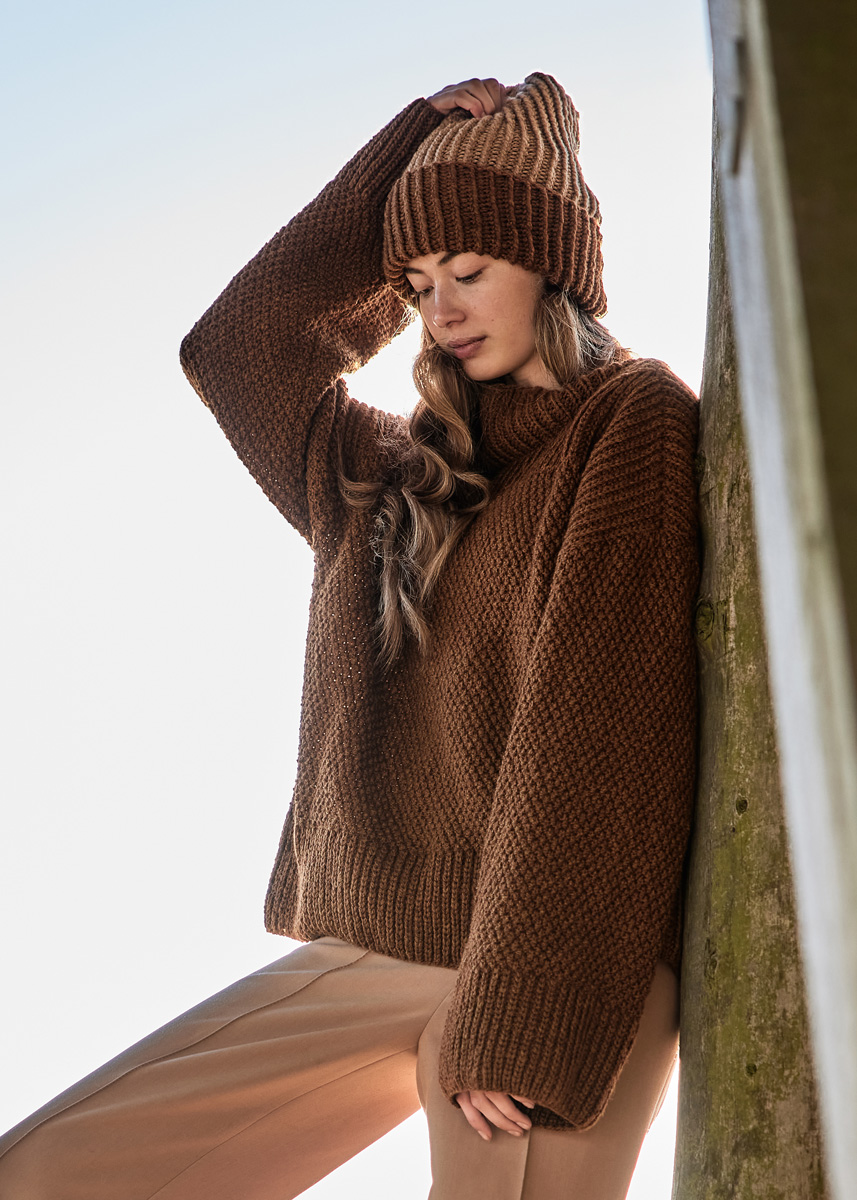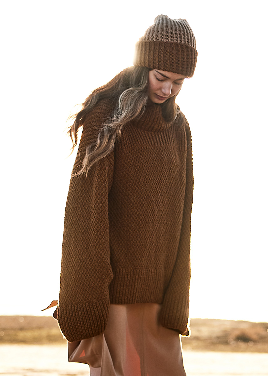 Lana Grossa-Qualität „Cool Merino“ (90 % шерсть (меринос), 10 % полиамид, длина нити = ок. 150 m/50 g): ок 550 (600–650) г нуга (цв 9); сп. № 5 и 5,5, 1 кр. сп. № 5.