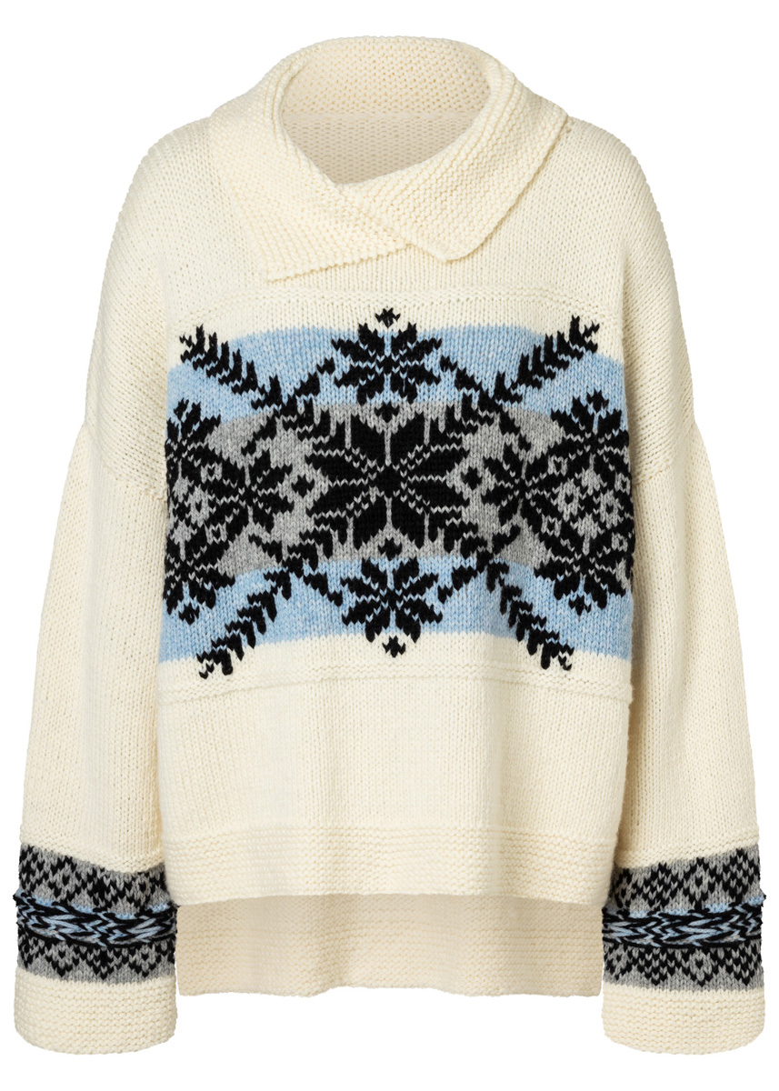 450 (500–550) г белой (цв. 15), 100 (150–150) г светло-синей (цв. 6), 100 (150–150) г свет- ло-серой (цв. 13) и 50 (100–100) г черной (цв. 14) пряжи Cool Merino (90% шерсти мерино экстрафайн, 10% поли- амида, 150 м/50 г) фирмы Lana Grossa; прямые спицы № 5,5 и № 6, круговые спицы № 6 длиной 40 см.