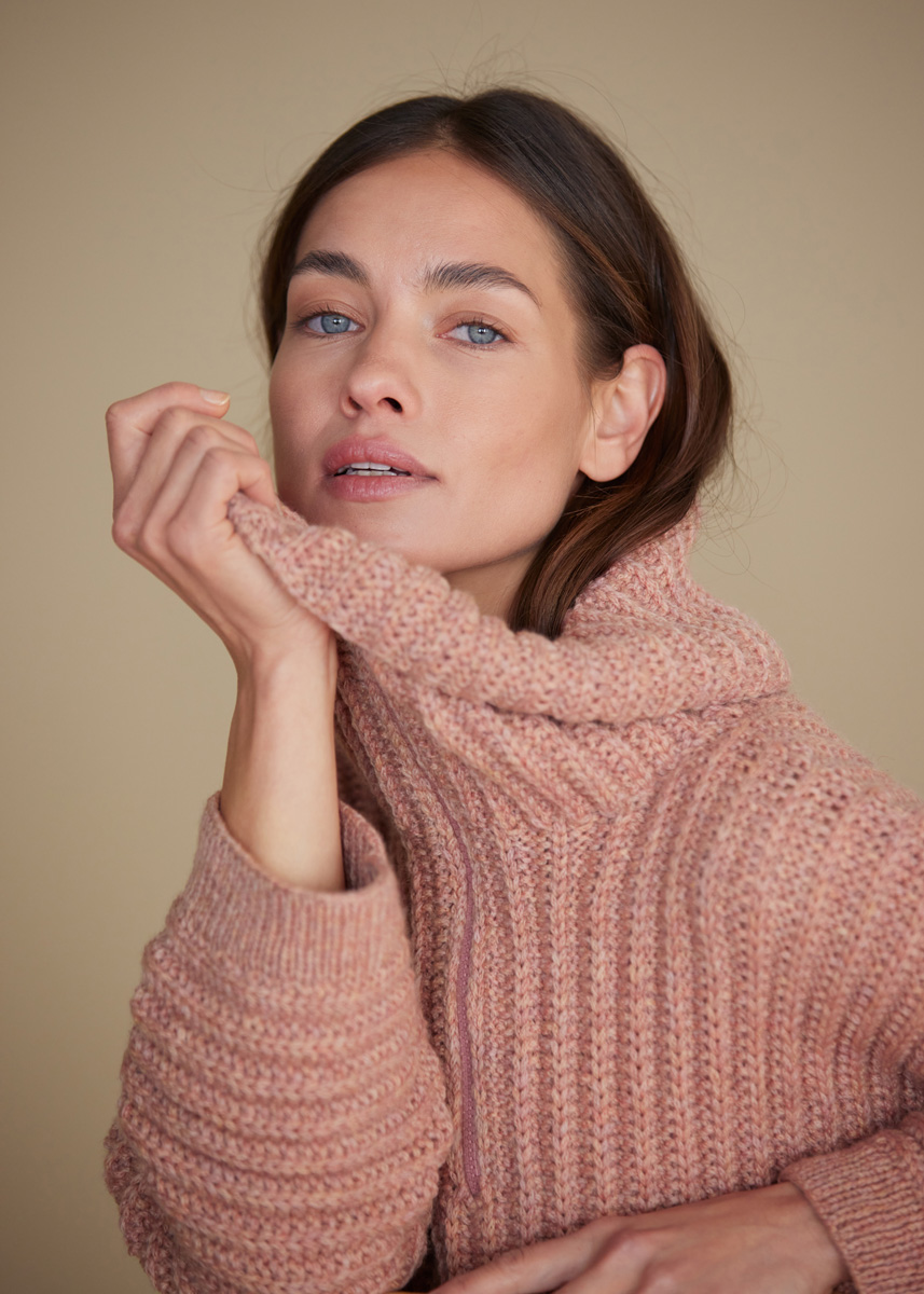 Lana Grossa-Qualität „Cool Merino“ (90 % шерсть (меринрс), 10 % полиамид, длина нити = ca 150 m/50 g): ок 600 (650–700–750) г розовый (цв 26); сп. № 4 и 5; 1 кр. сп. № 5; 1 молния 35 см