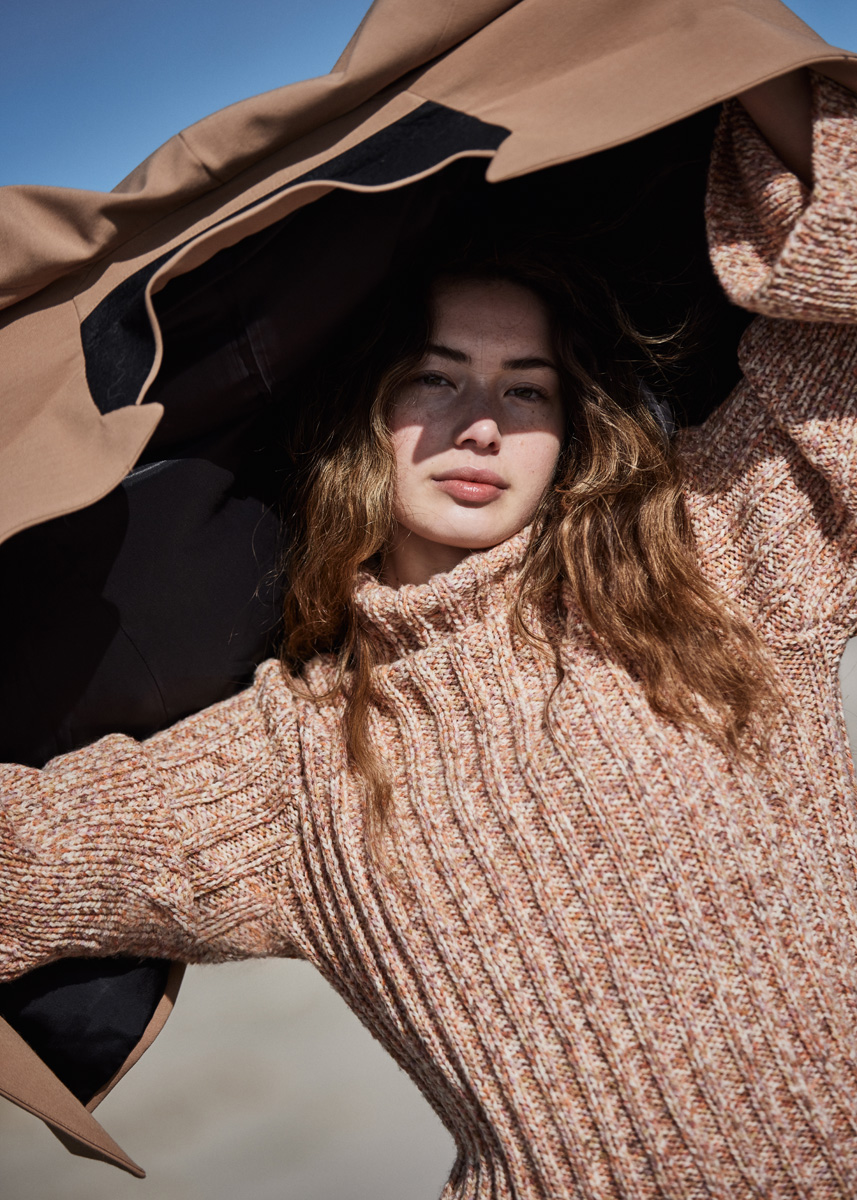 Lana Grossa-Qualität „Cool Merino Print“ (90 % шерсть (меринос), 10 % полиамид, длина нити = ок. 150 m/50 g): ок 400 (450–500) г чисто-белый/сирень/ оранжевый/горчичный (цв 106); сп. № 5 и 6, кр. сп. № 5