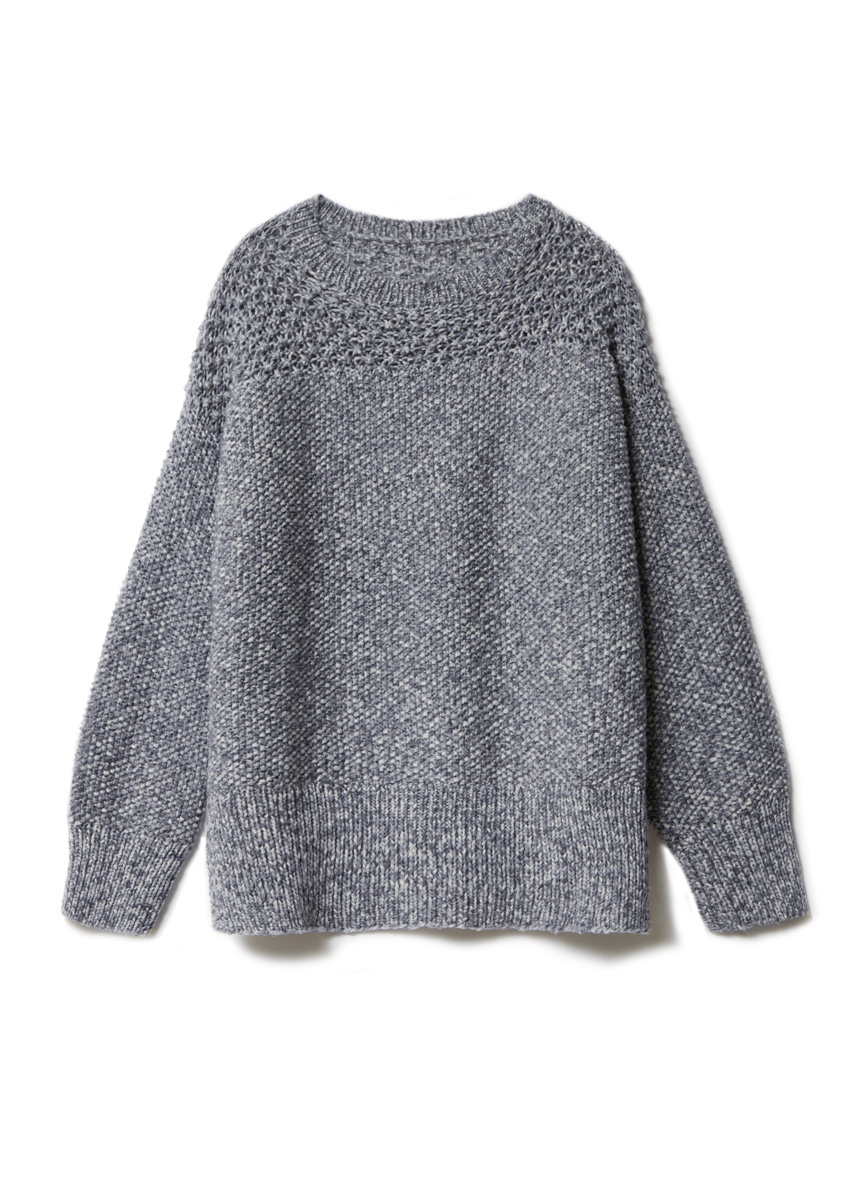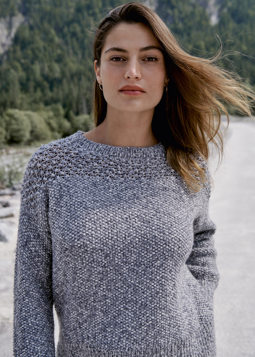 450 (500–550) г белой суровой/темно-/светло-серой (цв. 107) пряжи Cool Merino Print (90% шерсти мерино, 10% полиамида, 150 м/50 г) фирмы Lana Grossa; прямые спицы № 5 и № 6, круговые спицы № 4,5 длиной 40 см
