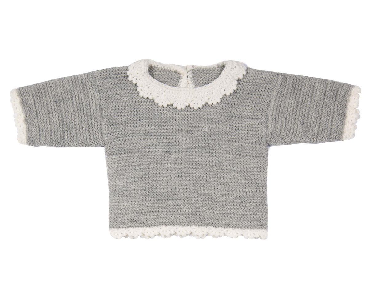 Lana Grossa Cool Wool Baby (100 % шерсть, длина нитки 220 m/50 g) 100 г светло-серый меланжевый (цв 206) и 50 г белый (цв 207); сп. № 3, кр. сп. № 3 длиной 40 см, крючок № 2,5; 1 пуговица 10 мм Ø
