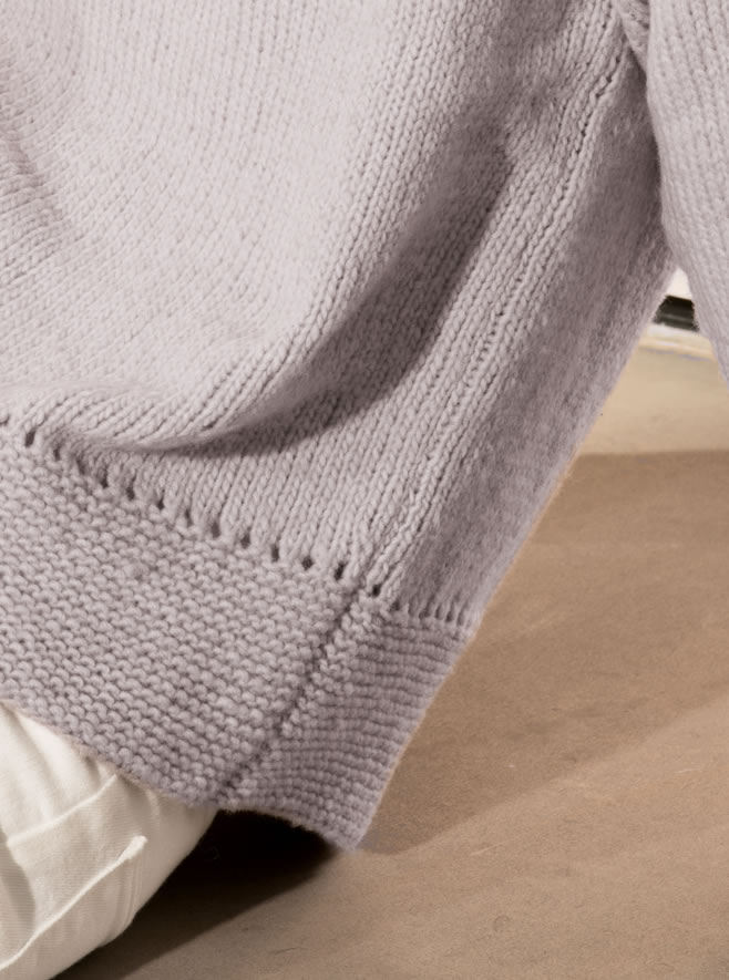 350 (400/450) г нежно-лиловой ( цвет 948) пряжи Cool Wool Big фирмы Lana Grossa (100 % шерсти, 120 м/50 г); прямые спицы № 4, круговые спицы № 4 длиной 40 см.