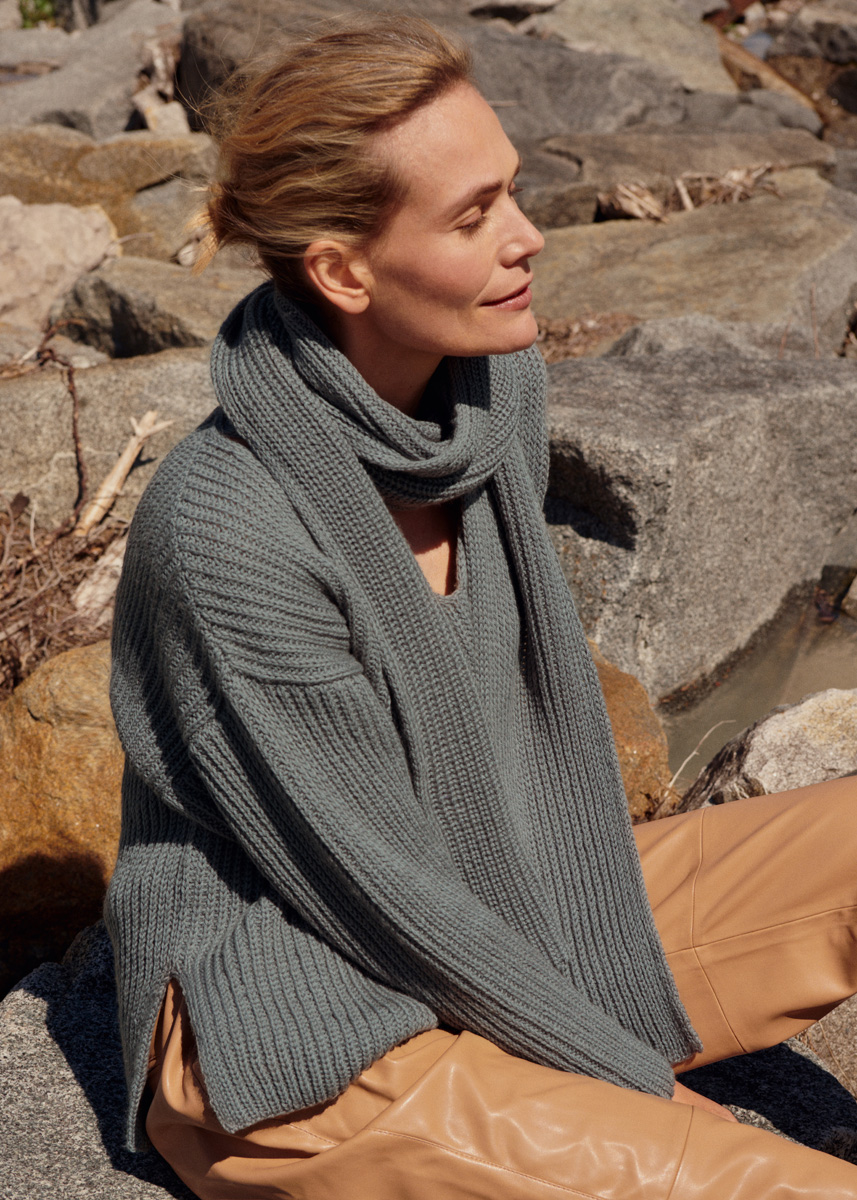500 (550–600) г бетонно-серой (цв. 38) пряжи Cool Wool Cashmere (90% овечьей (мерино- совой) шерсти, 10% кашемира, 160 м/50 г) фирмы Lana Grossa; прямые спицы № 4