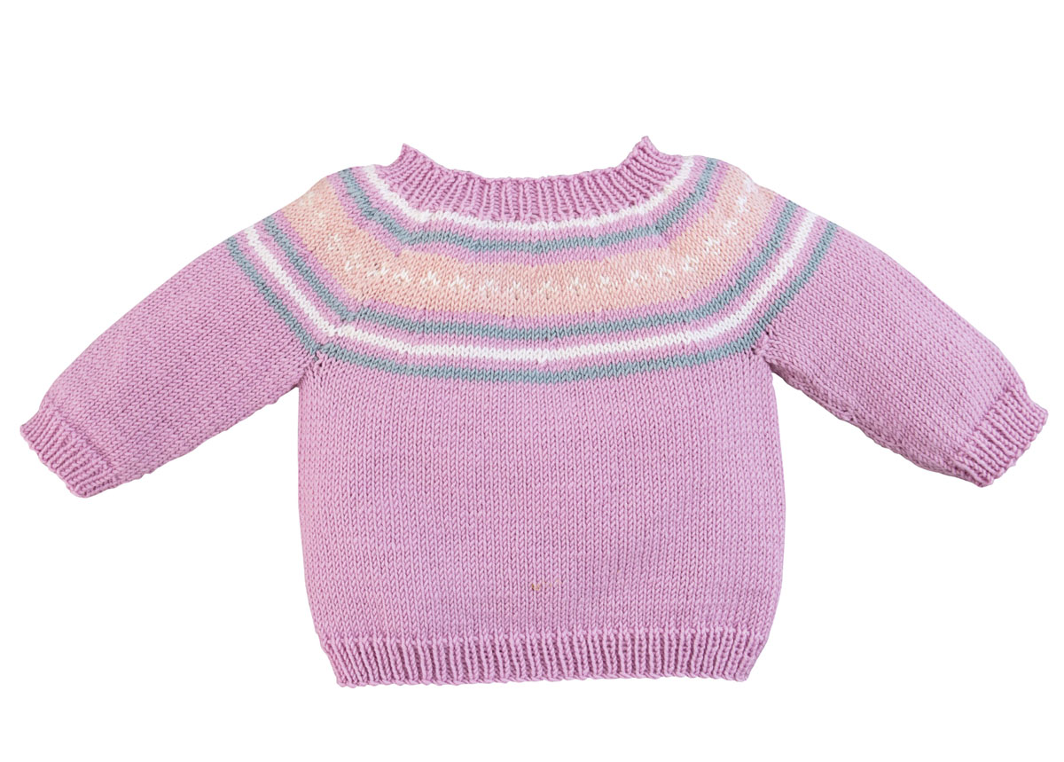 100 г сиреневой (цв. 580), 50 г белой (цв. 431), 50 г цвета розовой пудры (цв. 2018) и 50 г каменисто-серой (цв. 589) пряжи Cool Wool (100% шерсти, 160 м/50 г) фирмы Lana Grossa; прямые спицы № 3,5; круговые спицы № 3,5 длиной 40 см
