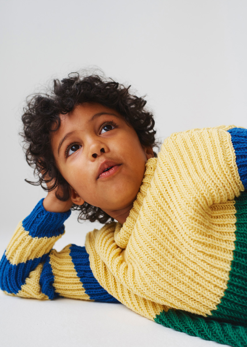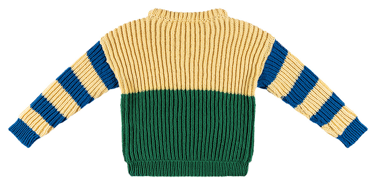 200 (250–250) г цвета ванили (цв. 411), 150 (200– 200) г зеленой (цв. 2017) и 100 (150–150) г чернильно-синей (цв. 2071) пряжи Cool Wool (100% шерсти, 160 м/50 г) фирмы Lana Grossa; прямые спицы № 3,5 и № 4, круговые спицы № 4 длиной 40 см