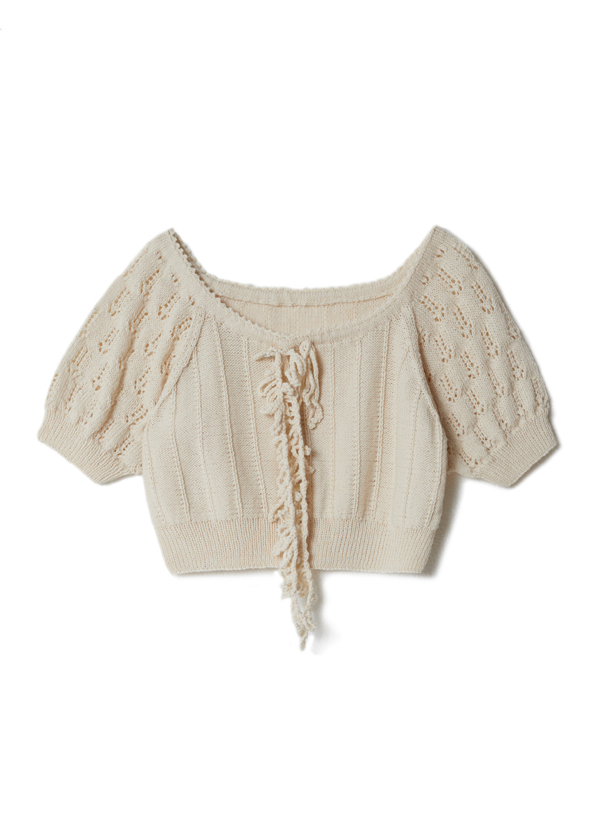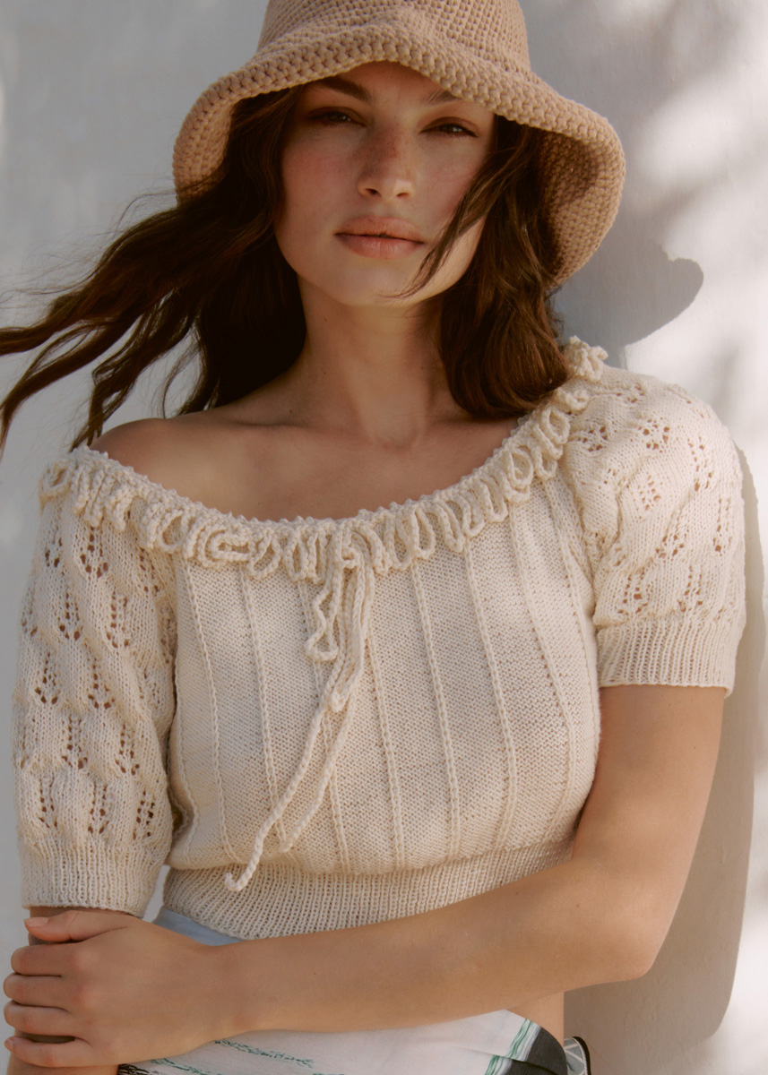 Lana Grossa-Qualität „Cotton Wool” (53 % шерсть (меринос), 47 % хлопок, длина нити = ок. 195 m/50 g): ок. 200 (250) г кремовый (цв. 12); сп. № 3,5 и 4, 1 кр. сп. № 3,5, 60 см; по 1 крючок № 3,5 и 4,5