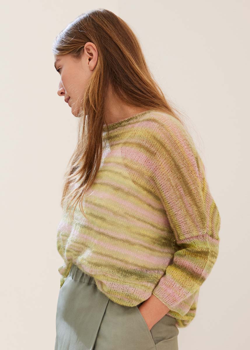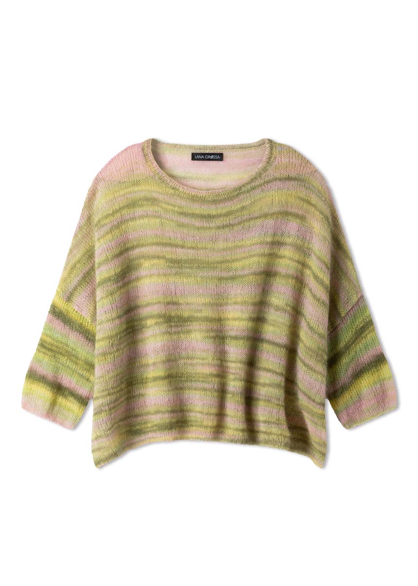Lana Grossa-Qualität „Cottonhair“ (70 % мохер (суперкид), 30 % хлопок, длина нити = ca 450 m/50 g): ок 100 (150–150–150) г ванильный/ розовый/ветхо-розовый/тёмно- оливковый/пастельно-зелёный (цв 108); сп. № 3,5 и 4; 1 кр. сп. № 3,5.