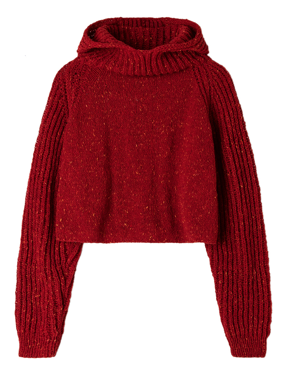 350 (400–450) г красной меланжевой (цв. 111) пряжи Country Tweed Fine (100% шерсти, 180 м/ 50 г) фирмы Lana Grossa; прямые спицы № 3,5 и № 4, круговые спицы № 4 длиной 40 см, 2 вспомогательные спицы.