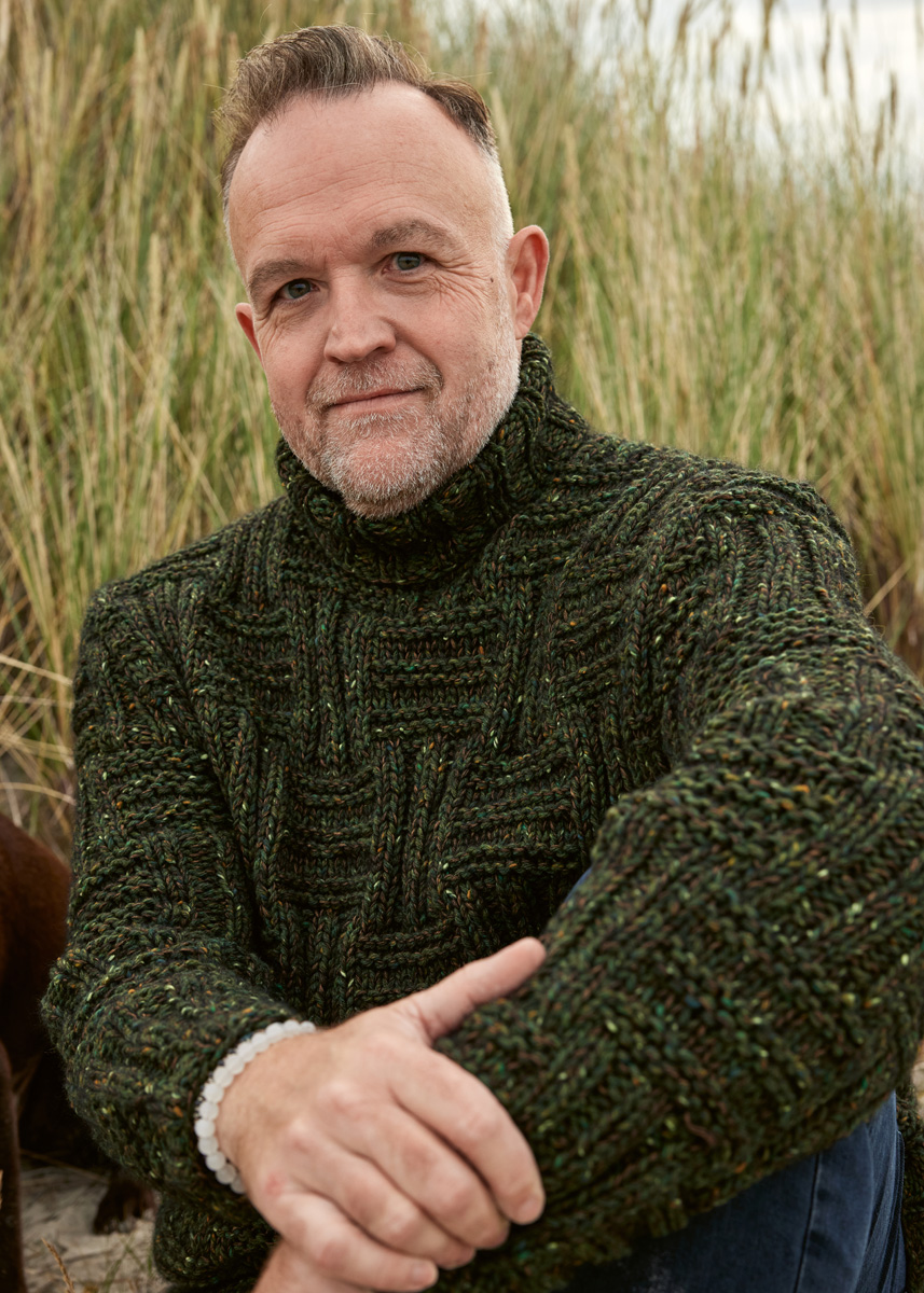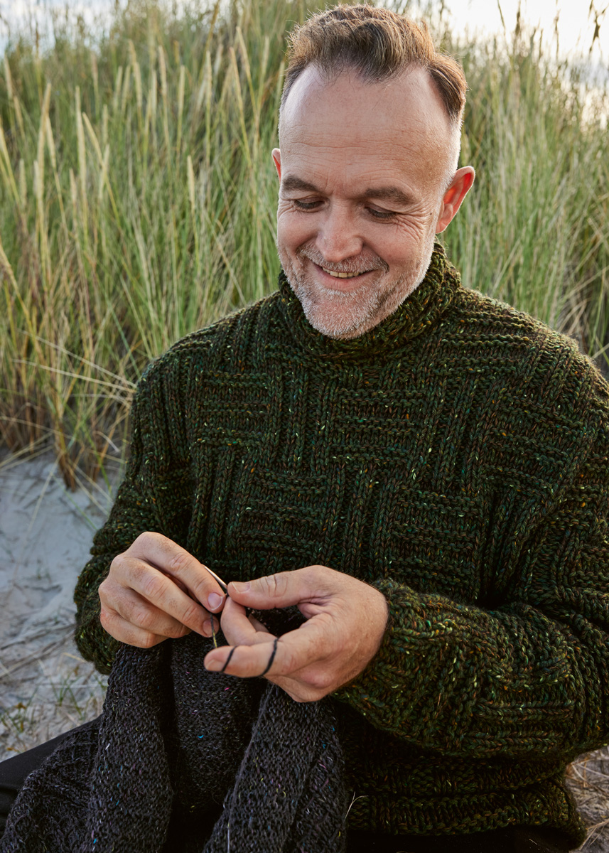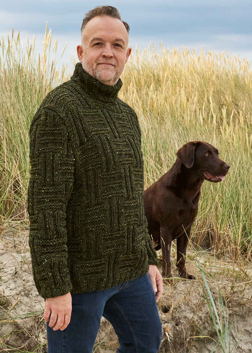 Lana Grossa Country Tweed (100% шерсть, длина нити 90 m/50 г), 650 (700 – 750 – 750) г тёмно-зелёный меланжевый (цв 7) и Lana Grossa Puno Due (63% хлопок, 37% альпака (беби), длина нити 210 m/50 g), 250 (300 – 350 – 350) г нуга/черно коричневый (цв 6); сп. № 6 и 7, 1 кр. сп. № 6.