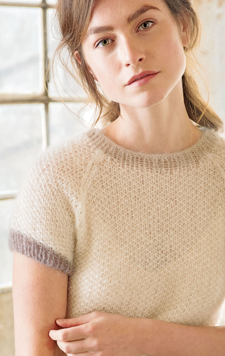 100 (125) 125 г неотбеленной (цвет 52), 25 г коньячной (цвет 95), 25 г серо-бежевой (цвет 35) и 25 г меланжевой натуральной/цвета шелка-сырца (цвет 701) пряжи “Silkhair“ (70 % мохера суперкид, 30 % шелка, 210 м/25 г) фирмы Lana Grossa. Длинные круговые спицы № 6 и 6,5, короткие круговые спицы № 5
