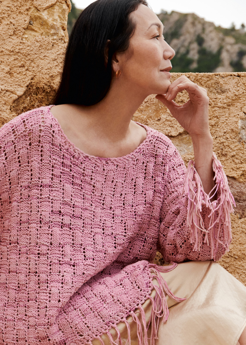 600 (650–700) г розо- вой (цв. 7) пряжи Ecco (65% хлопка, 23% шелка, 12% вискозы, 120 м/50 г) фирмы Lana Grossa; прямые спицы № 5 и крючок № 4