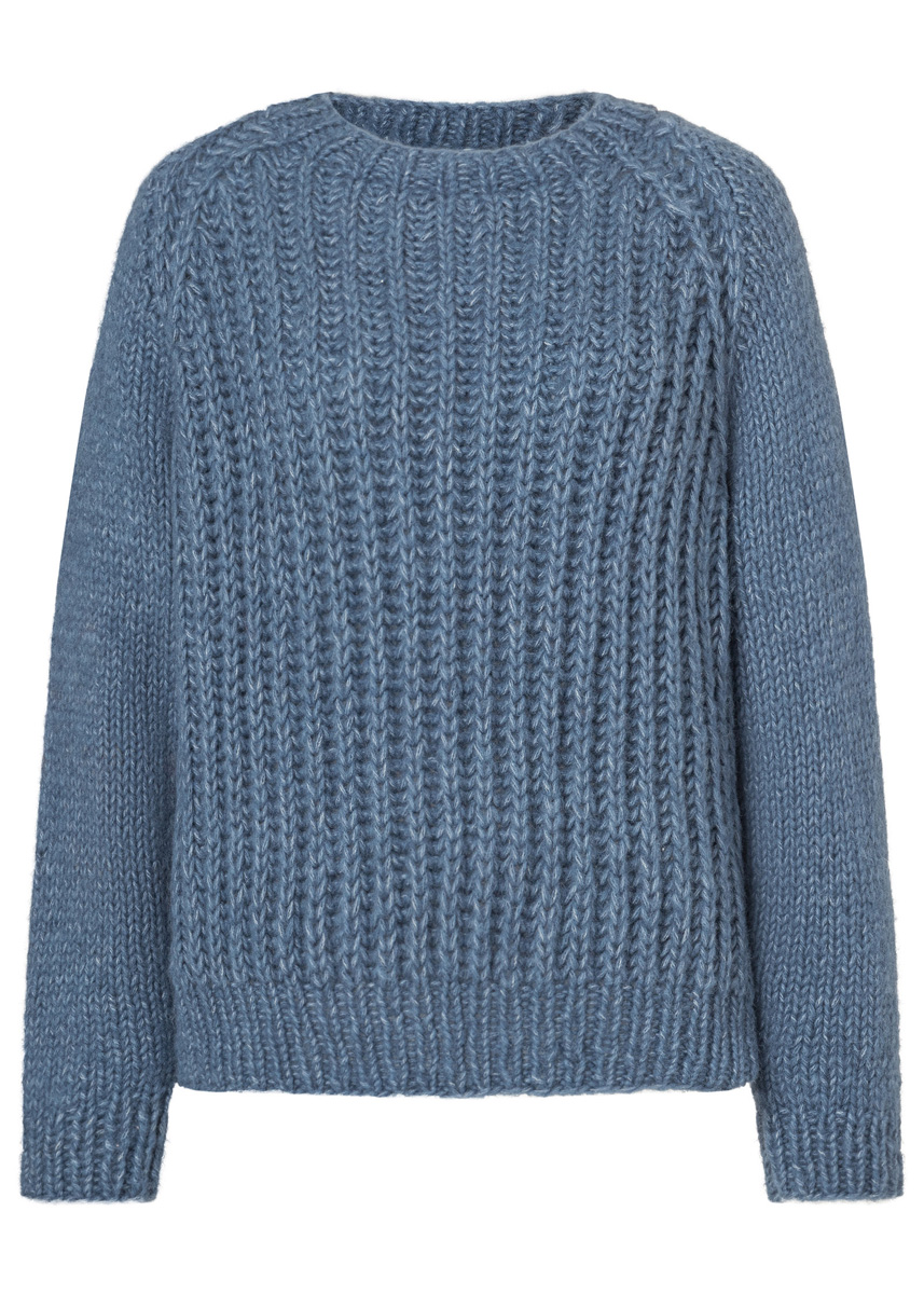 550 (600–650) г джин- совой (цв. 123) пряжи Ecopuno Chunky (48% хлопка, 33% шерсти мерино экстра- файн, 19% альпака бэби, 70 м/50 г) фирмы Lana Grossa; прямые спицы № 7 и № 8, кру- говые спицы № 7 длиной 40 см