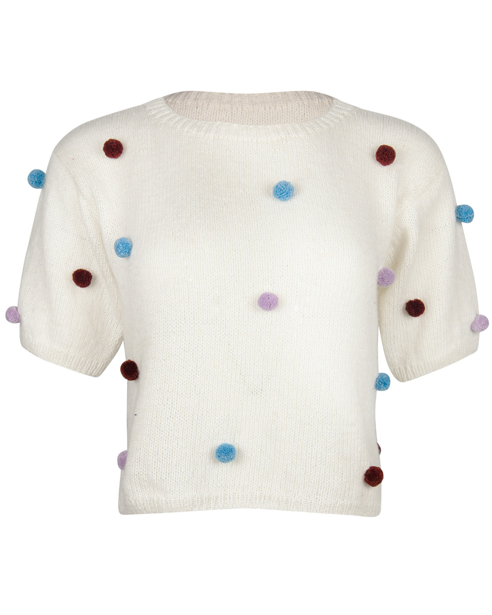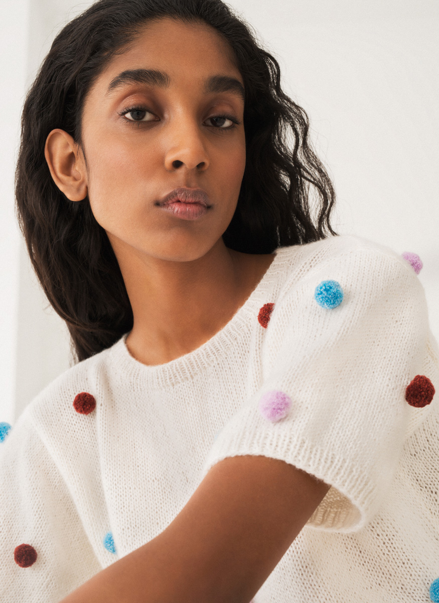 Lana Grossa Ecopuno (72 % üлопок, 17 % vериносовая шерсть, 11 % fльпака. Длина нити: около 215 m / 50 g), 200 (250 – 300) г белый (цв 26), 50 г коричневый красный (цв 31), 50 г бирюзовый (цв 29) и 50 г пурпурный (цв 30); спицы № 3 и 4, 1 кр. спицы №. 3, длиной 40 см, 1 набор для изготовления помпонов Lana Grossa