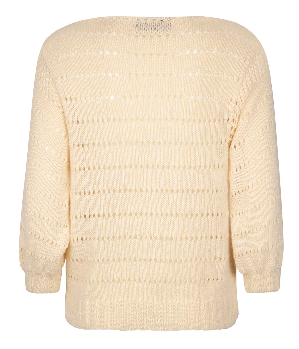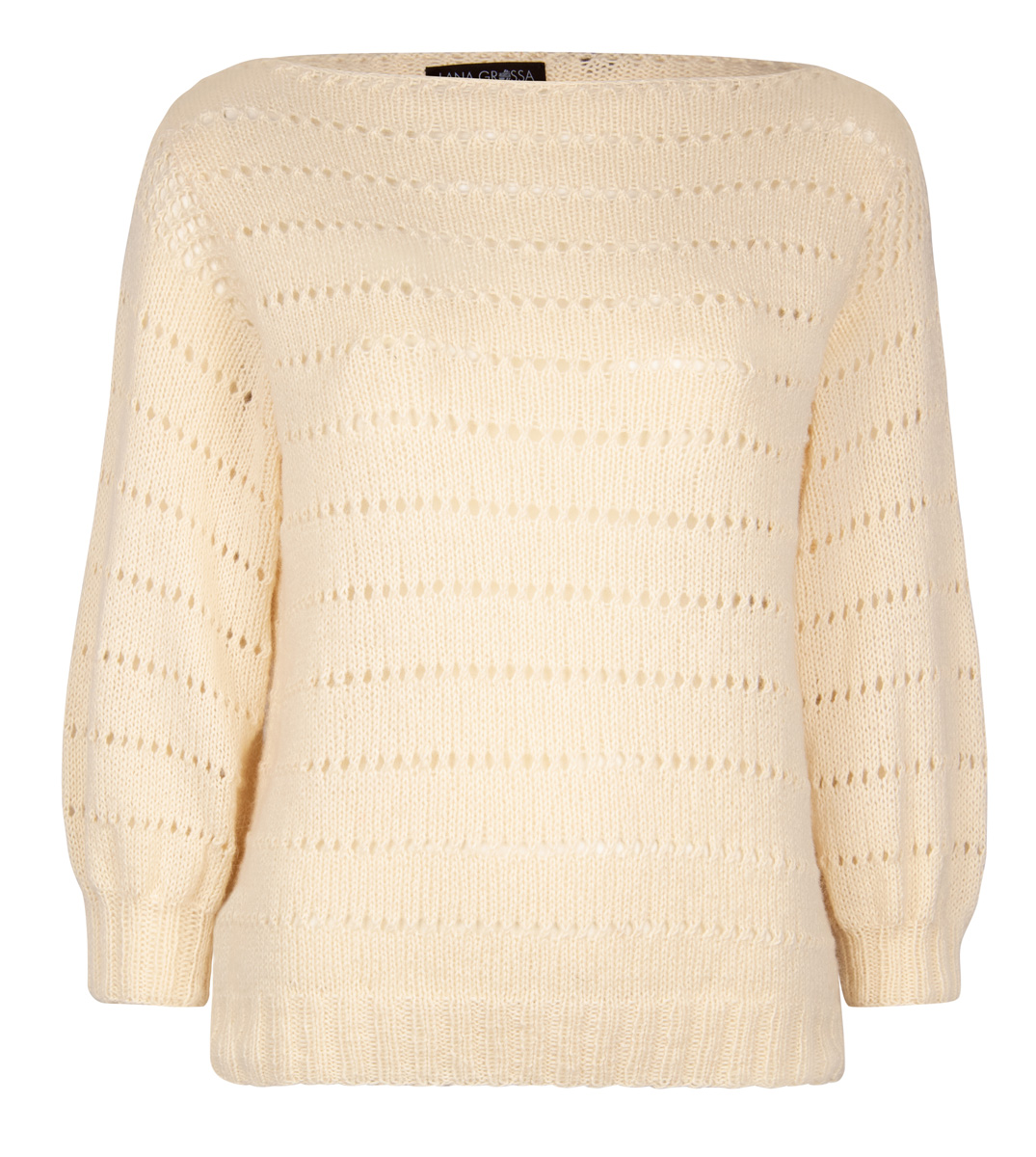 Lana Grossa-Qualität „Ecopuno” (72 % хлопок, 17 % шерсть (меринос), 11 % (беби) альпака, длина нити = ок. 215 m/50 g): ок. 250 (300) г экрю (цв. 46); сп. № 3,5 и 4,5