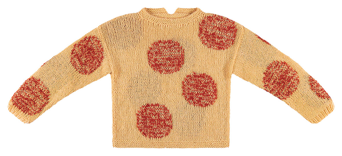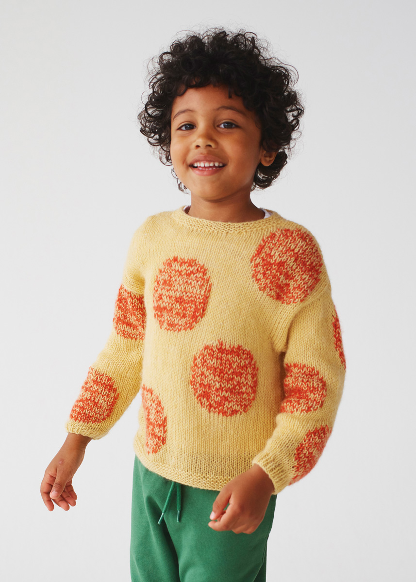 для пуловера с красными кружками 150 (200–200–250) г цвета слоновой кости (цв. 61) и 50 г красно-оранжевой (цв. 34),