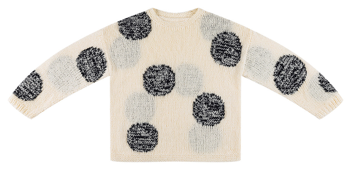 для пуловера с черными кружками 150 (200–200– 250) г цвета экрю (цв. 46) и 50 г черной (цв. 16) пряжи Ecopuno (72% хлопка, 17% овечьей (мериносовой) шерсти, 11% шер- сти ягненка альпака, 215 м/50 г) фирмы Lana Grossa;