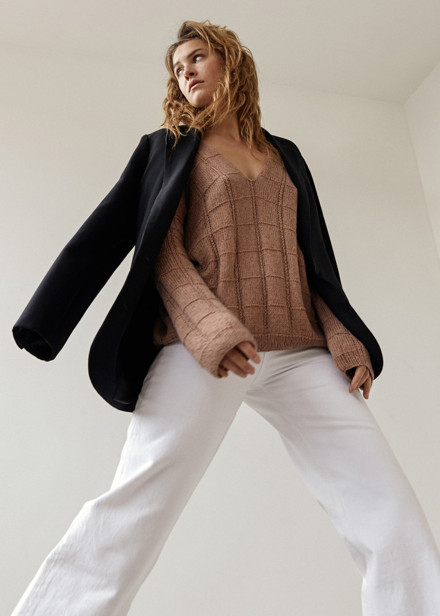 350 (400–450) г цвета верблюжьей шерсти (цв. 32) пряжи Ecopuno (72% хлопка, 17% шерсти мерино, 11% альпака бэби, 215 м/50 г) фирмы Lana Grossa; круговые спицы № 3 и № 4 длиной 40 и 80 см, дополнительная леска круговых спиц для набора открытых петель